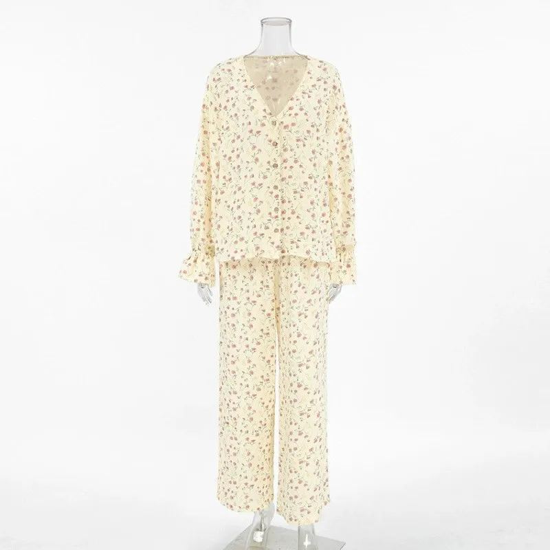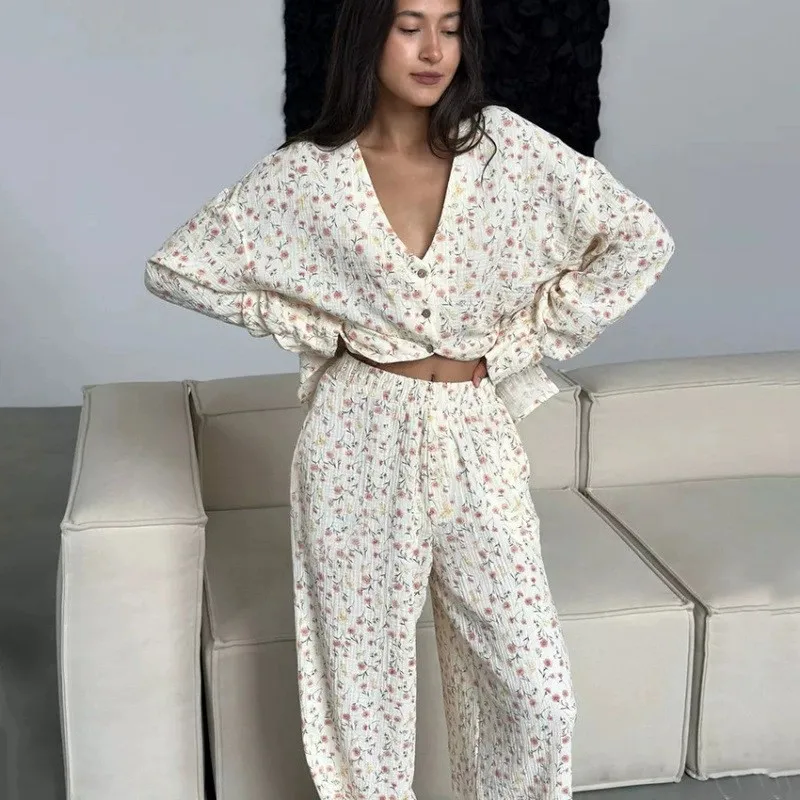100% Cotton Cardigan Pajama Set Women Winter Long Sleeved Pants Pajamas Loose Home Clothing Wholesale Bulk Order OEM Custom Logo