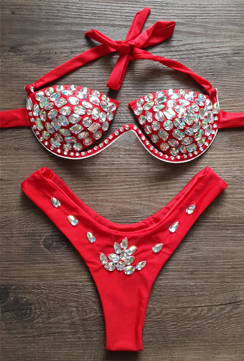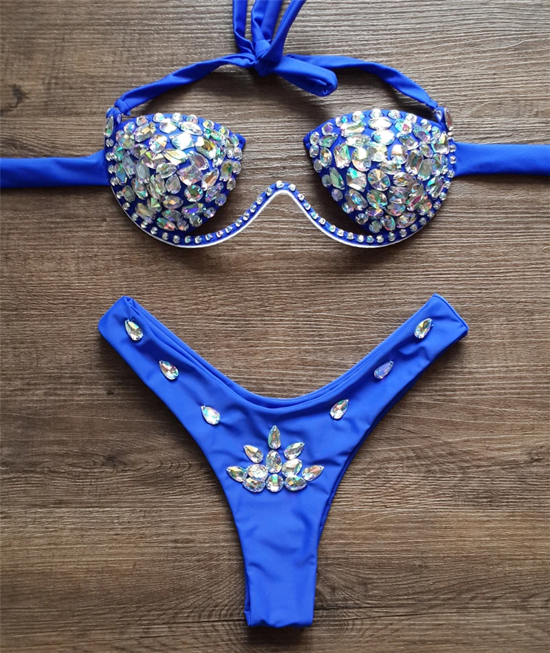 Crystal Bikinis New Sexy Push up Swimsuit Diamond Luxury Halter Swimwear Female Bandage Bather Bathing Suits Rhinestone