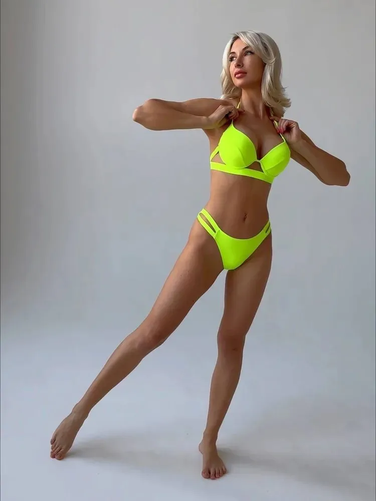 Wholesale Custom Logo Women Underwire Triangle Bikini Spaghetti Strap Push Up Swimsuit Cheeky Neon Green Two Piece Bathing Suit