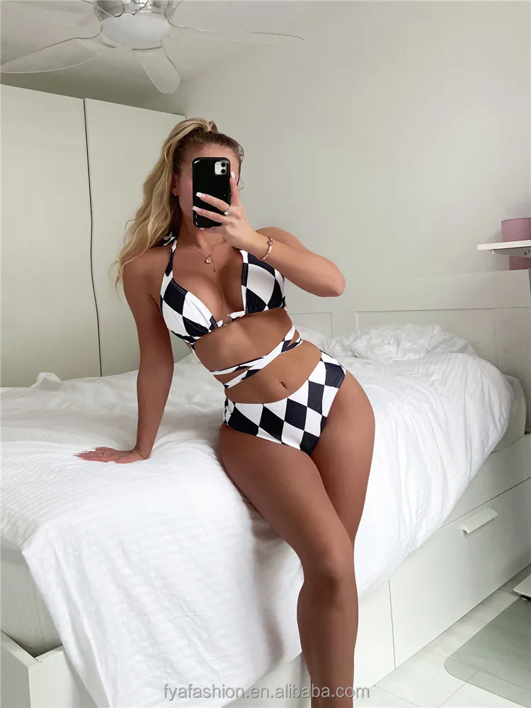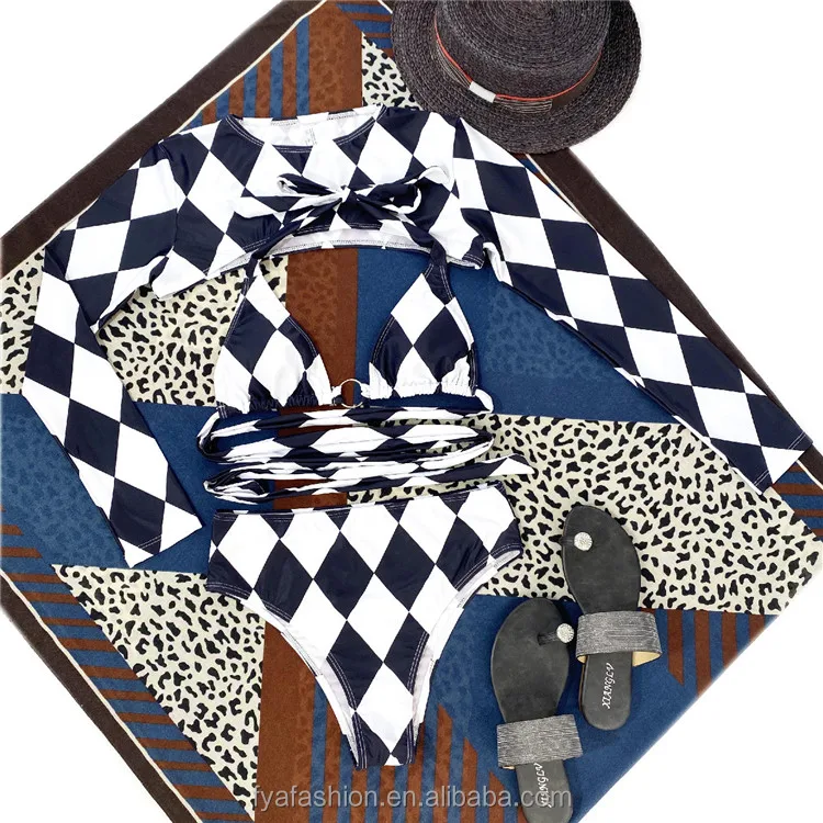 Black and White Plaid Long Sleeve 3 Piece Swimsuit Sexy Women
