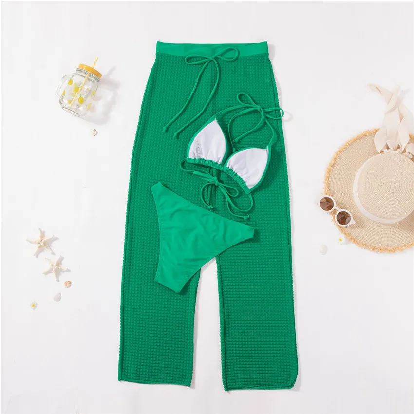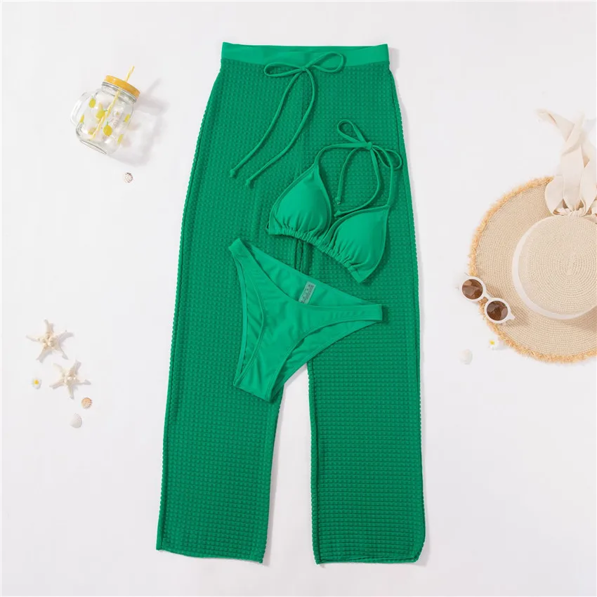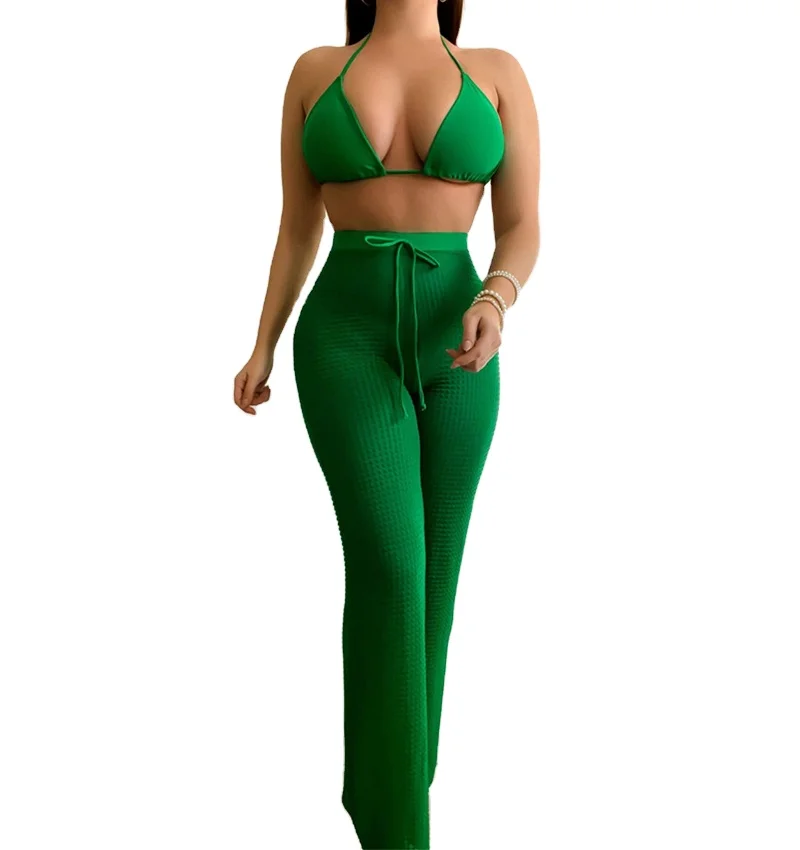 2026 New Women's Clothing Green Women Swimming Suit Swimwear 3 Piece Bikini Set With Beach Pants