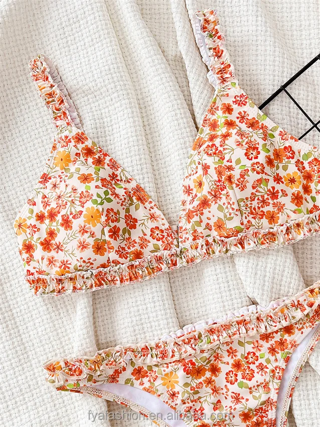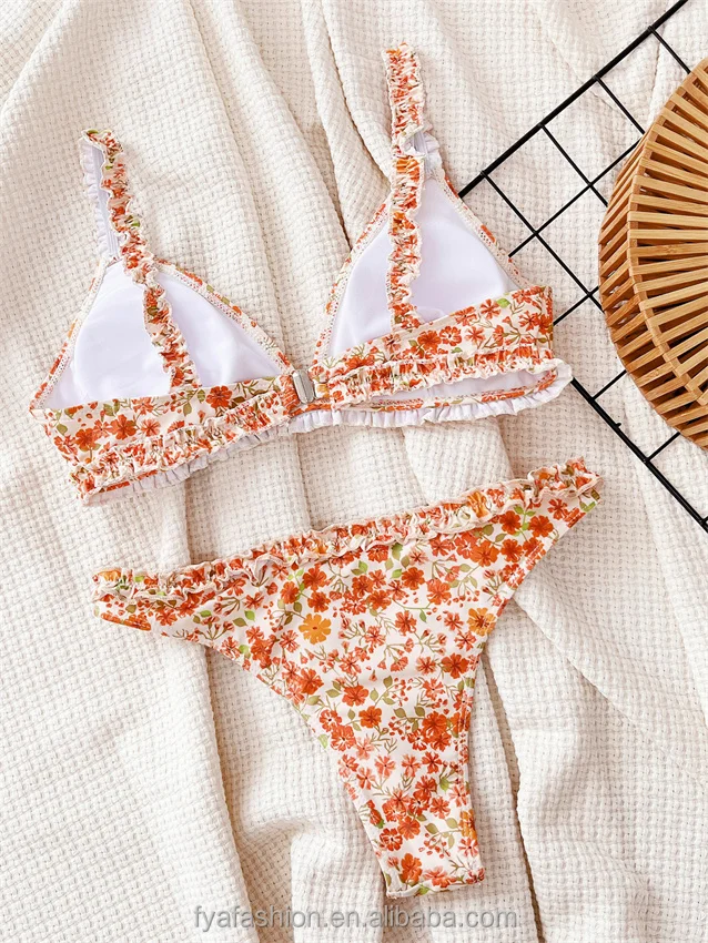 Stylish Sexy Two Piece Ruffled Floral Print Bikini Thong Swimwear Luxury Beach Wear Bathing Suit Set for Women