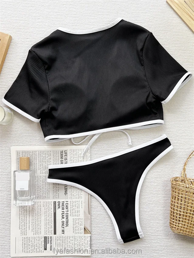 Hot Sexy Micro Girl Two Piece Racing Bikini Crop Top Competition Swimwear Short Sleeve Suit