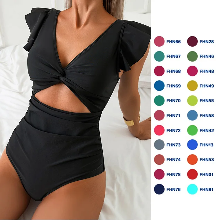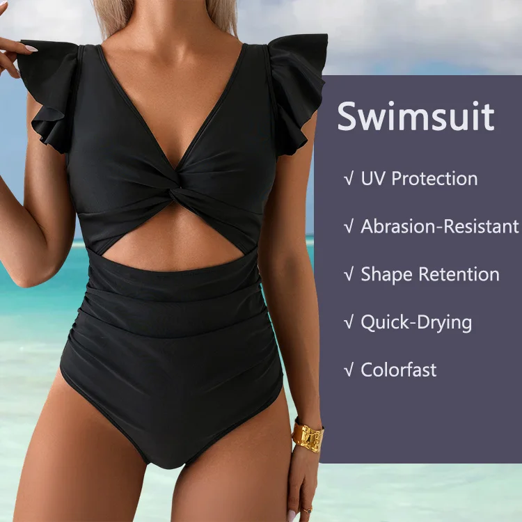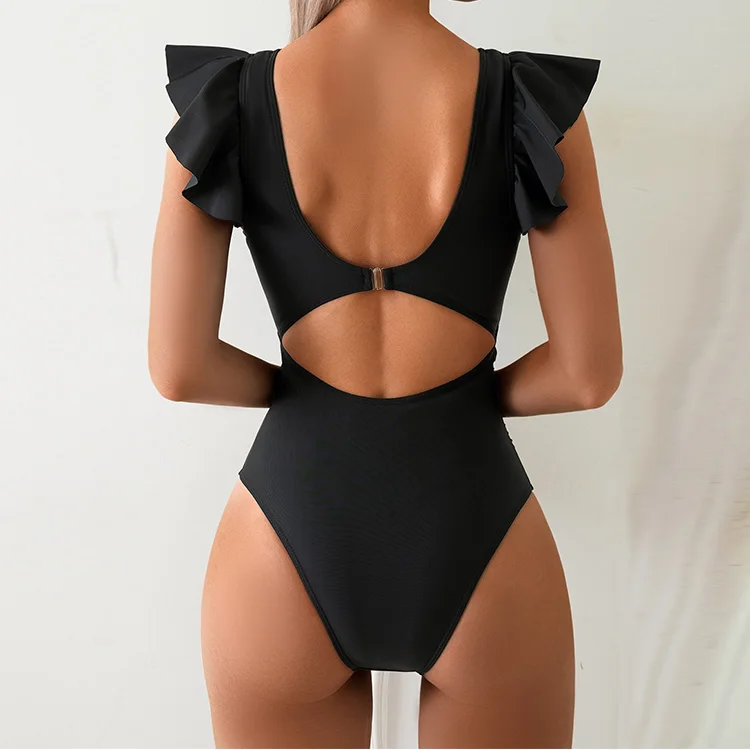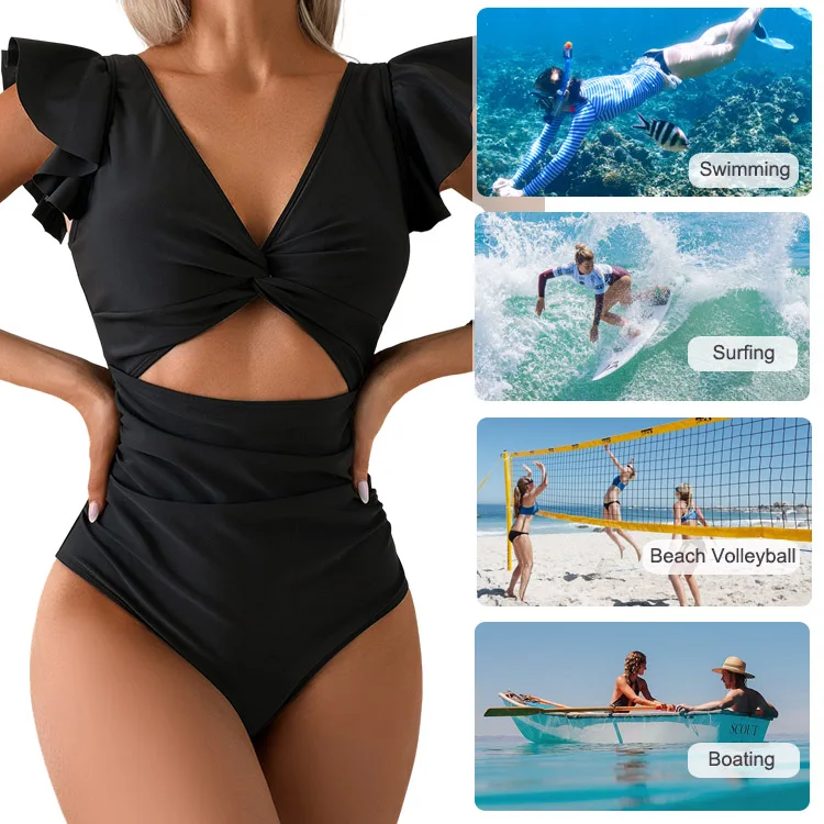 Quick-Dry One-Piece Swimsuit for Women Ruffle Sleeve V-Neck U-Back Bathing Suit with Padded Bra & Stretch Fit