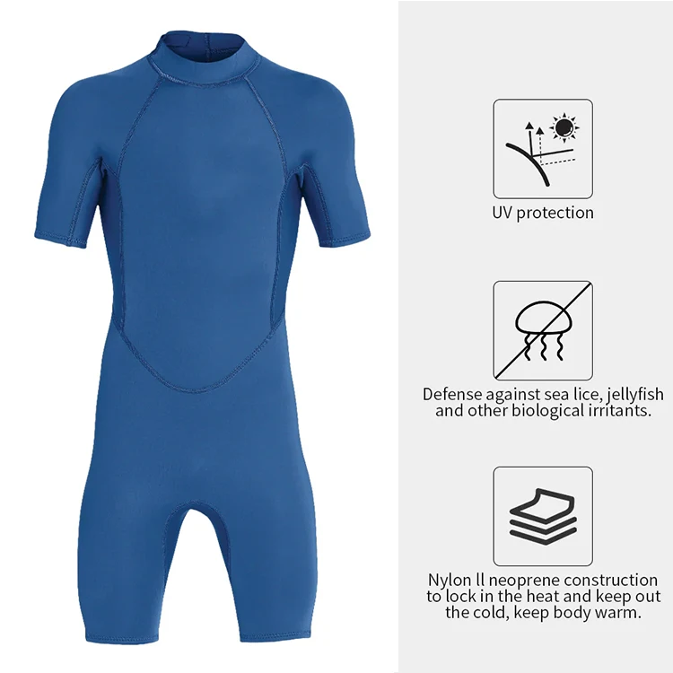 Solid Blue 2mm Neoprene Kids Short Sleeve Wetsuit Back Zip One Piece Diving Suit for Swimming and Surf Training