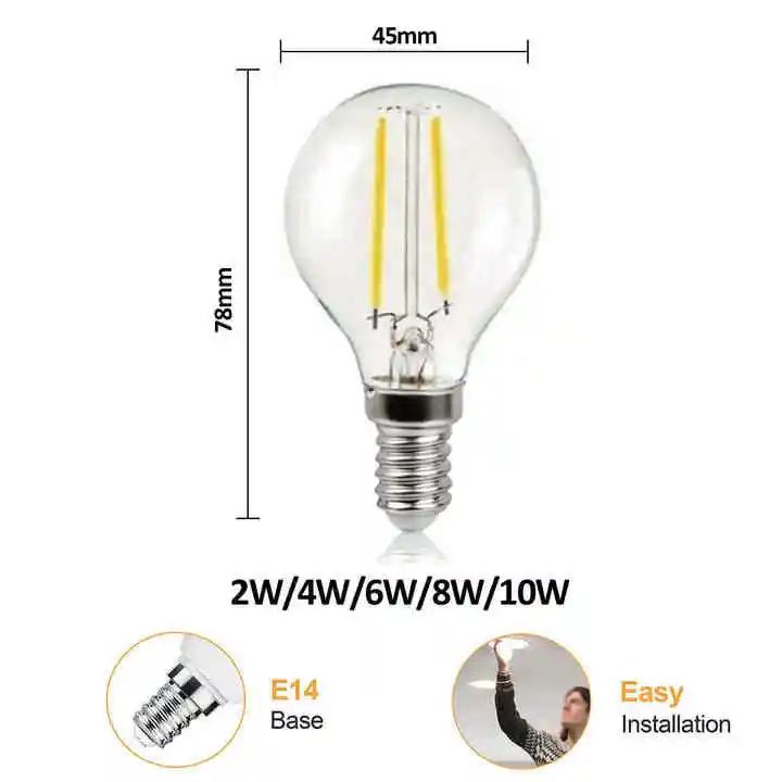 Vertak Hot Sale Factory G45 E14 Base Warm White Clear Glass 3000K 4000K 6500K Led Filament Bulb