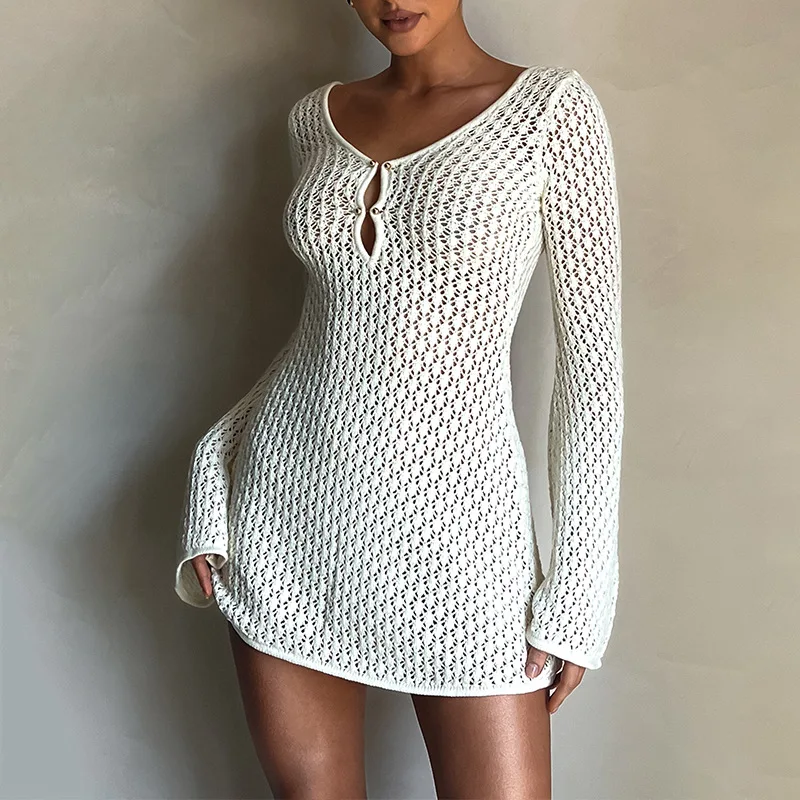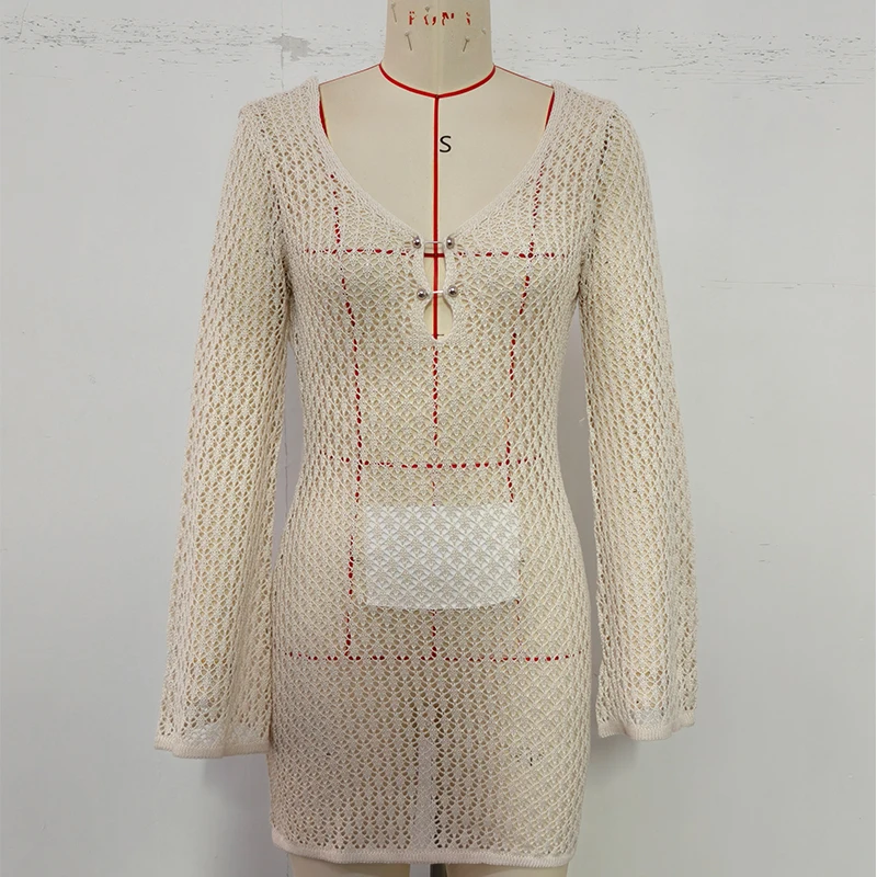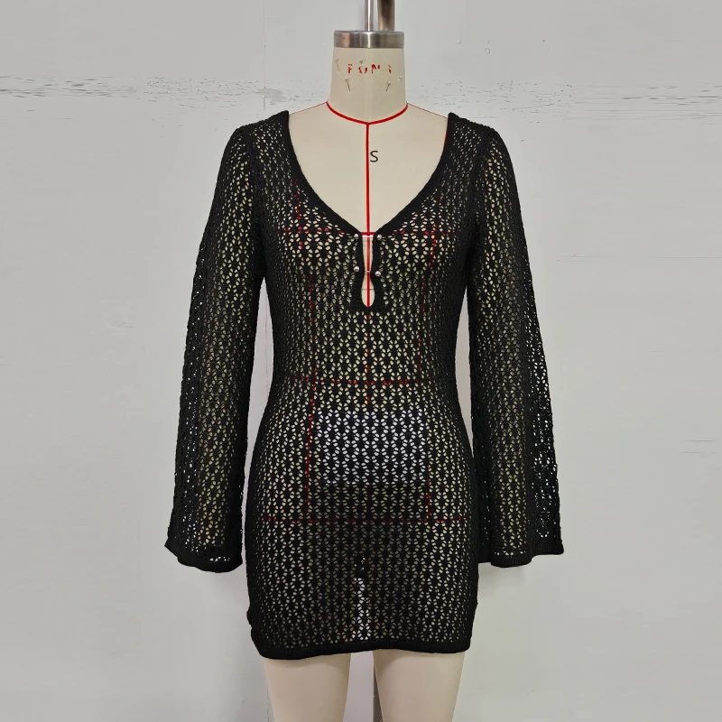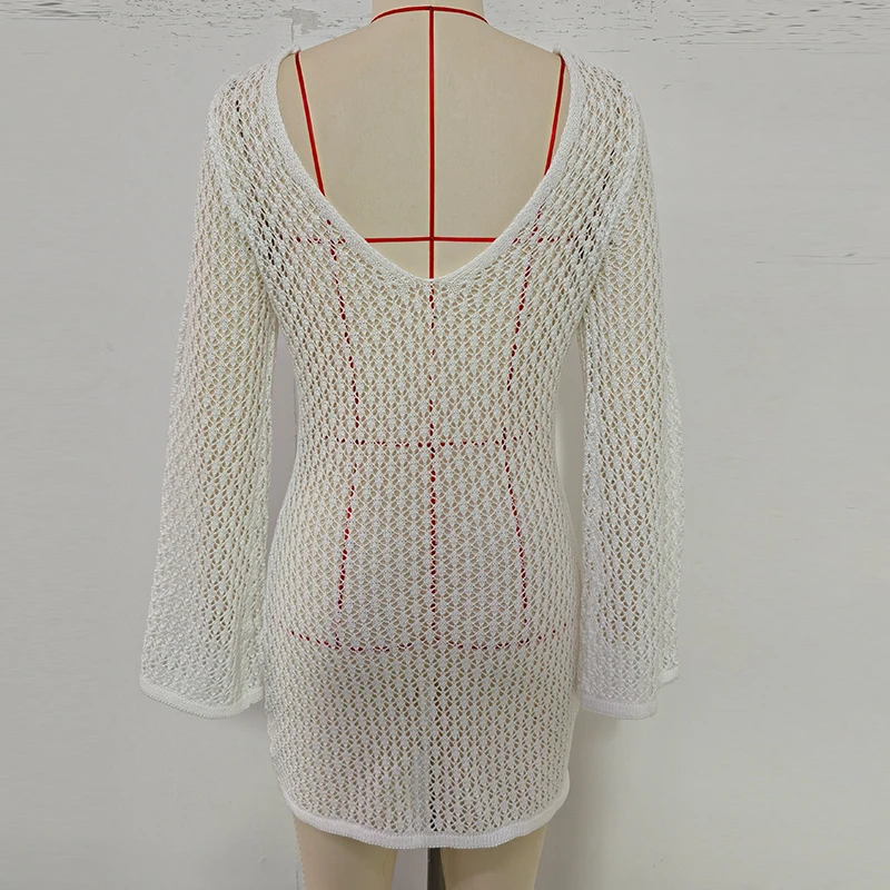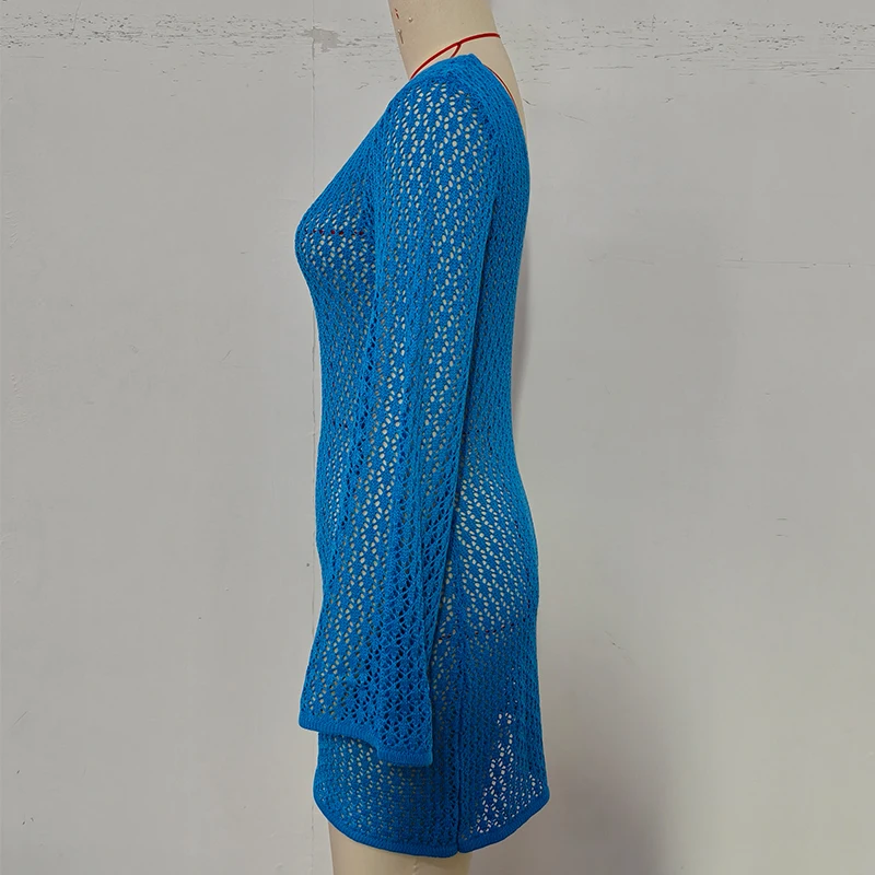 STOCK 5Colors Knitted Long Sleeve Women Dress Hollow Out Mini Dress Crochet Swimsuit Cover Ups S-L