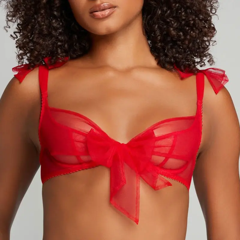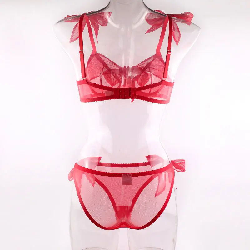 Solid Exotic Luxury Mesh Lace Lingerie for Women Hot Sexy Red Bow Bra Panty Sets for Young Ladies for Christmas Valentine's Day