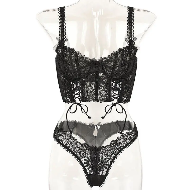 Wholesale Three-Piece Women's Sexy Black Lingerie Set Embroidered Flower Chain Transparent Hollow Out Lace Decoration ODM Supply