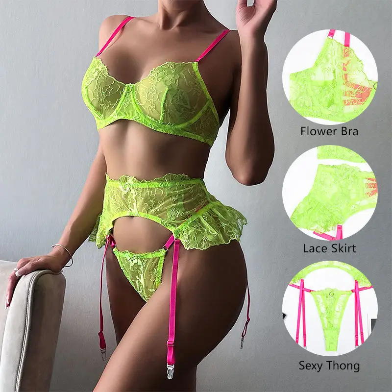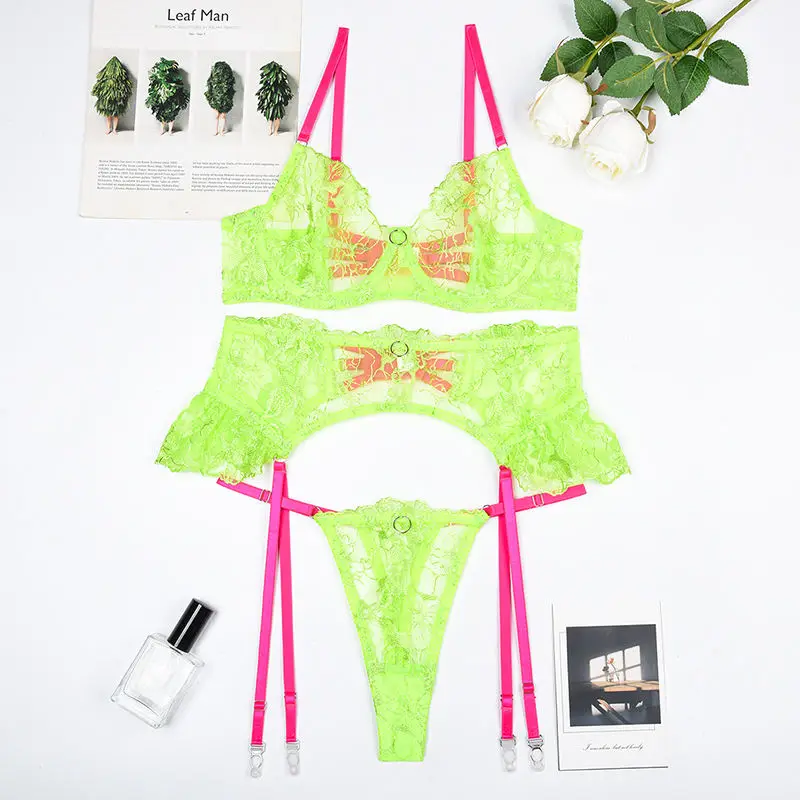 High Quality Young Woman's Phosphor Green Three-Piece Set Transparent Embroidered Lingerie with Lace Decoration ODM Supply