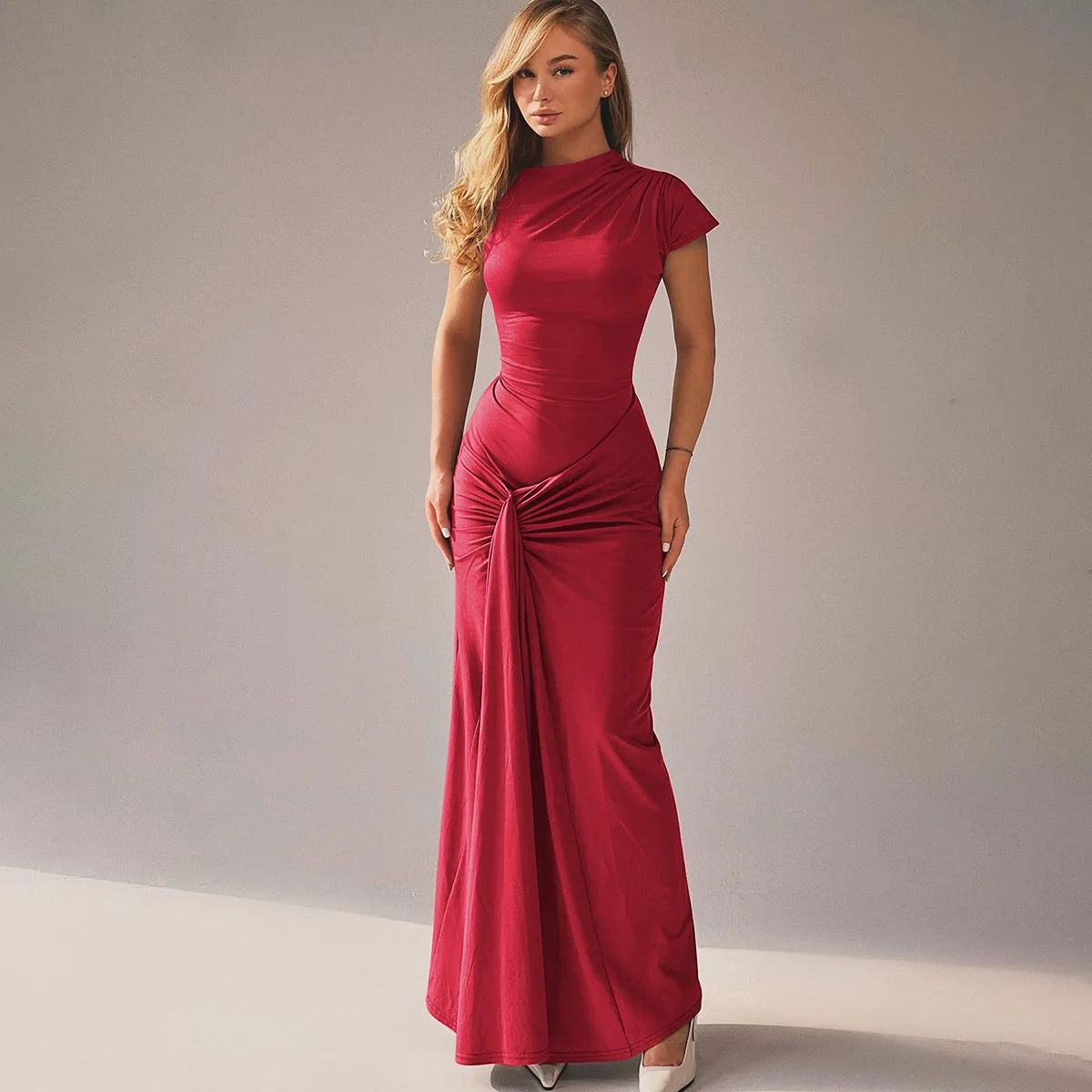 Elegant Solid Short Sleeve Bandage Draped Sexy Bodycon Maxi Prom Dress Summer Women Fashion Outfits Party Vacation 3275
