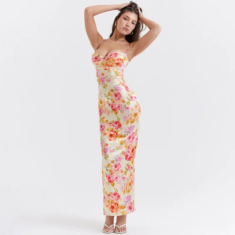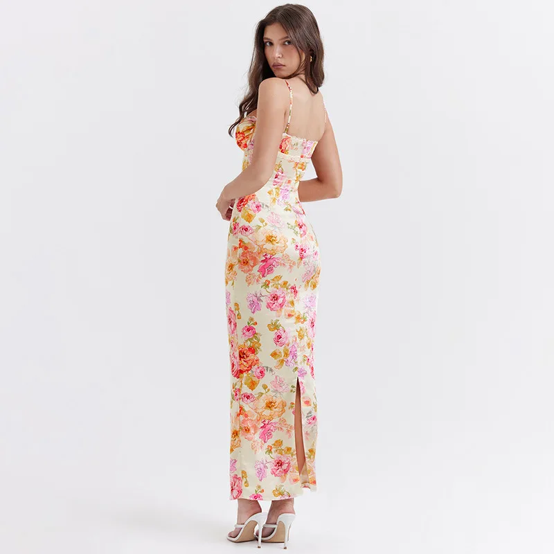Elegant Flower Print Suspender Dress Women Fashion Off Shoulder Backless Midi Dresses Chic Female Party Club Vestidos 2583