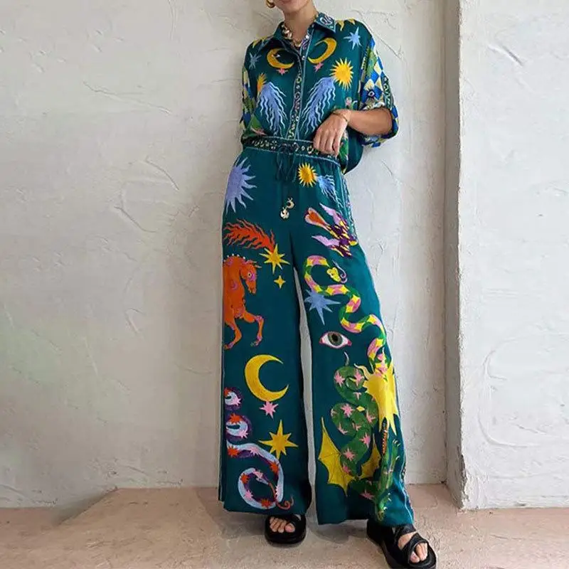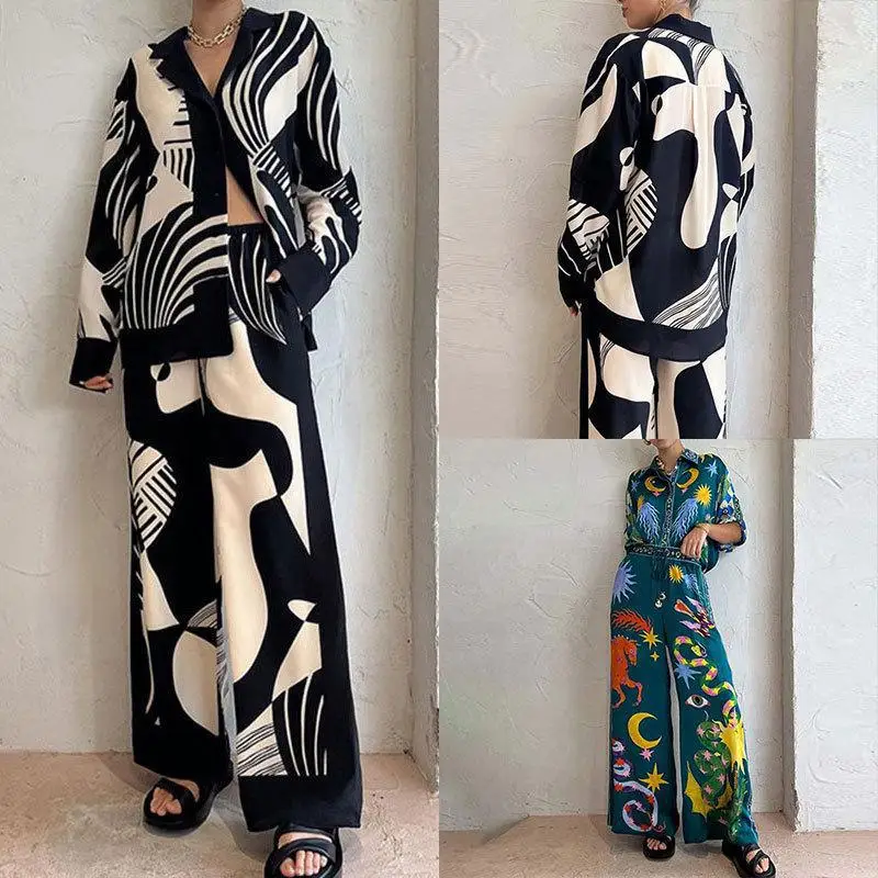 Fall New Arrivals Casual Positioning Printing Long Sleeve Blouse Shirt Straight Wide Leg Pants Two Piece Fashion Set Wholesale
