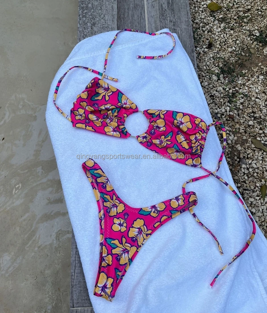 2023 Printed Fabric Custom Logo Color Women's Halter Thongs 2 Piece Set Sexy Bikini Swimwear Quick Dry Anti-Uv