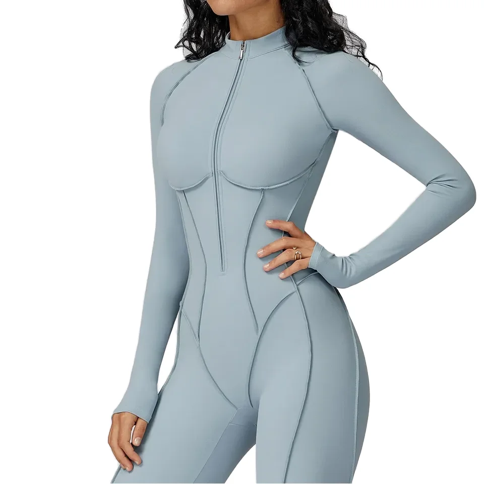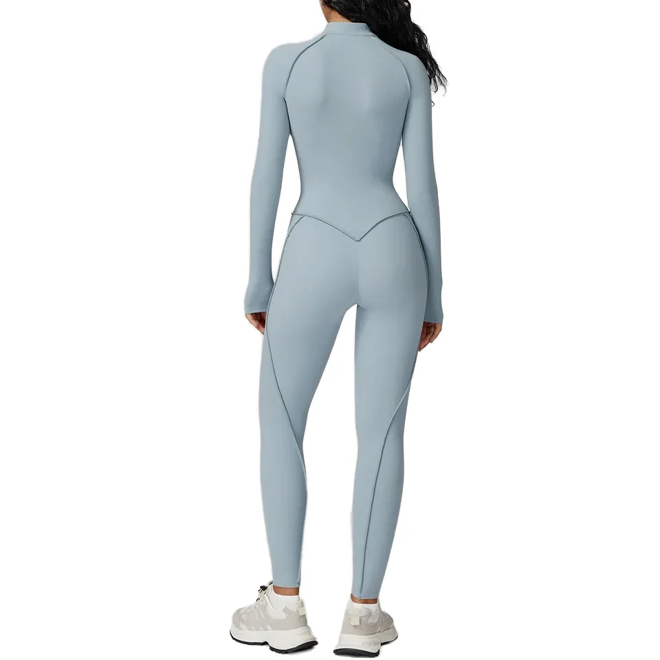 European American Style Solid Stand Collar Jumpsuit Half-Zip Breathable Nylon/Cotton Fitness Wear Women High-Intensity Exercise