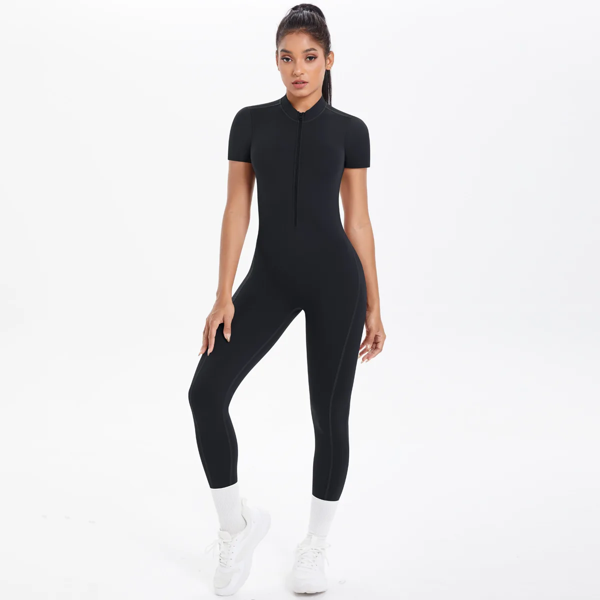 Custom Logo Women Onesie Bodysuit Sports One Piece Suit Short Sleeves Hip Leggings High Elastic Yoga Jumpsuit