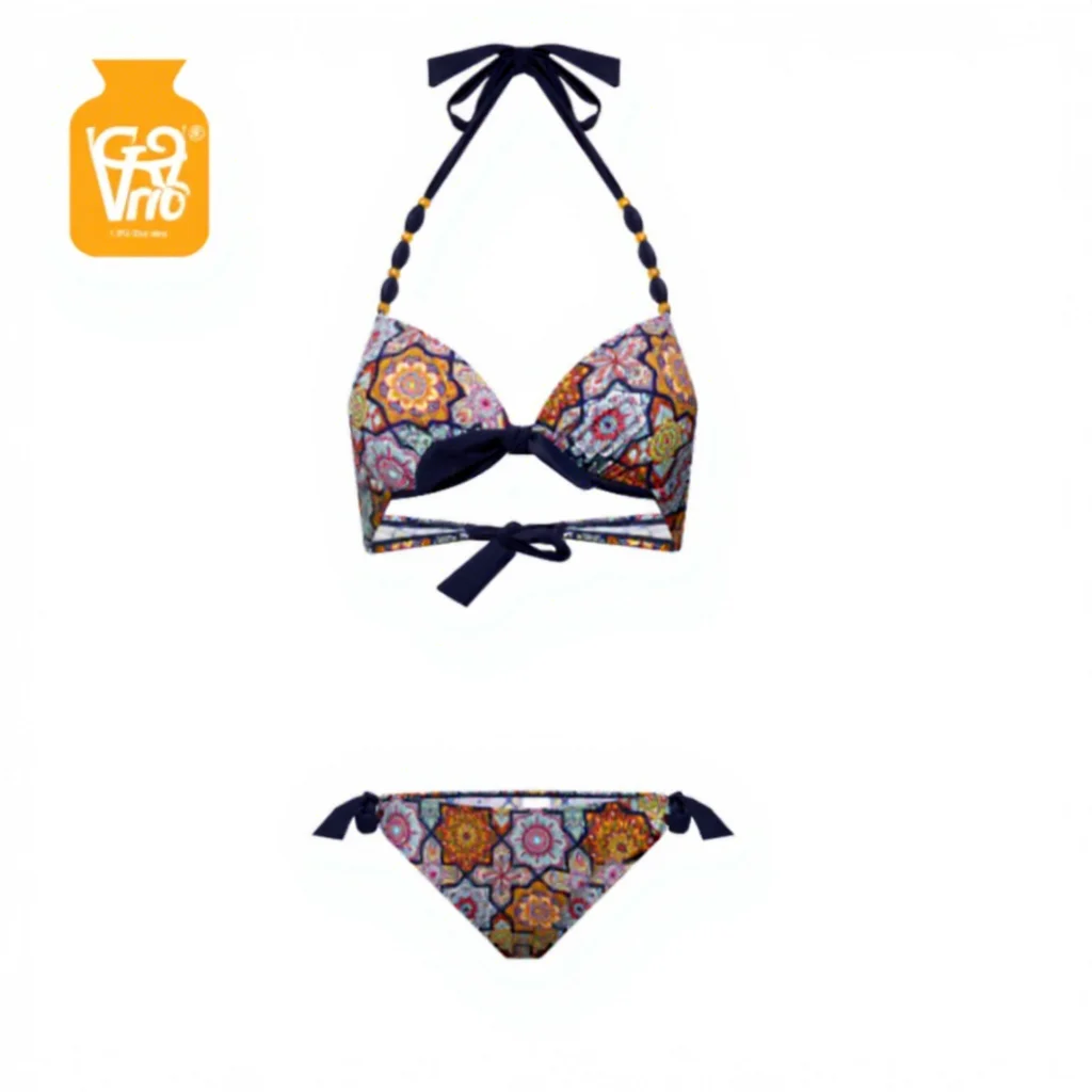 Custom Designer Boho Chic Brazilian Front Logo Soft Cup Fabric Swimsuit Beachwear Women String Bikini Set with Tropical Print