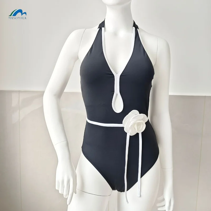 Custom 2026 New Solid Color Halter Neck 3D Floral Waist Slimming Beach Bikini One-Piece Swimsuit for Women