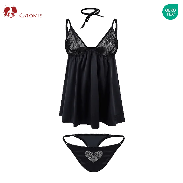 High Quality Fashion Pajamas Nightdress Black Side Slit Temptation Party Sexy Lace Short Dress Women's Lingerie Set