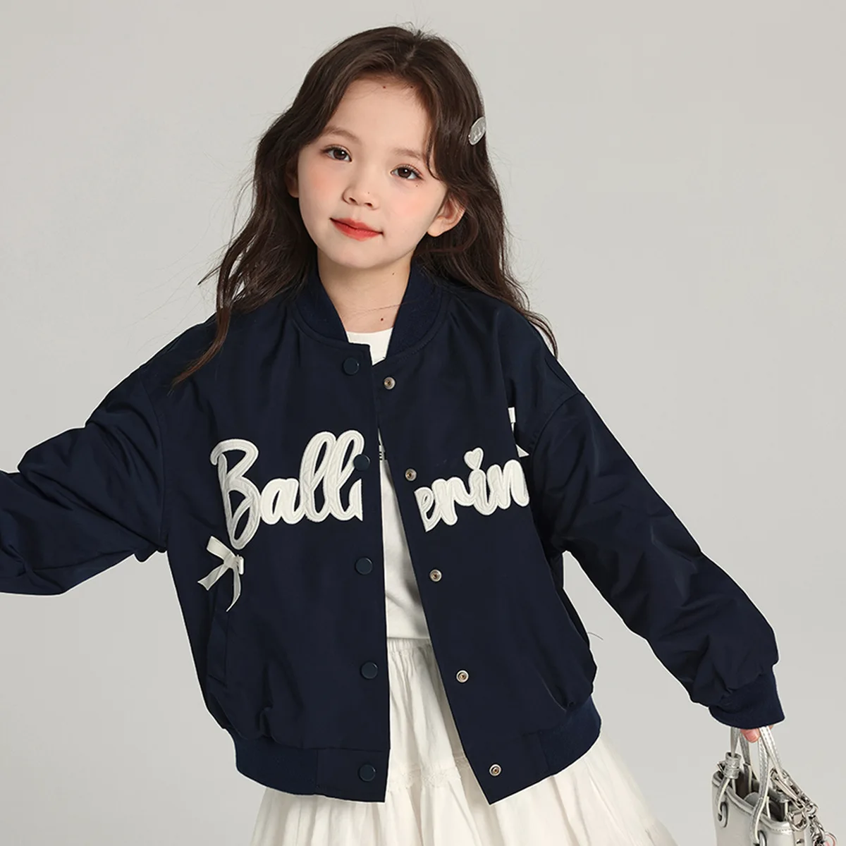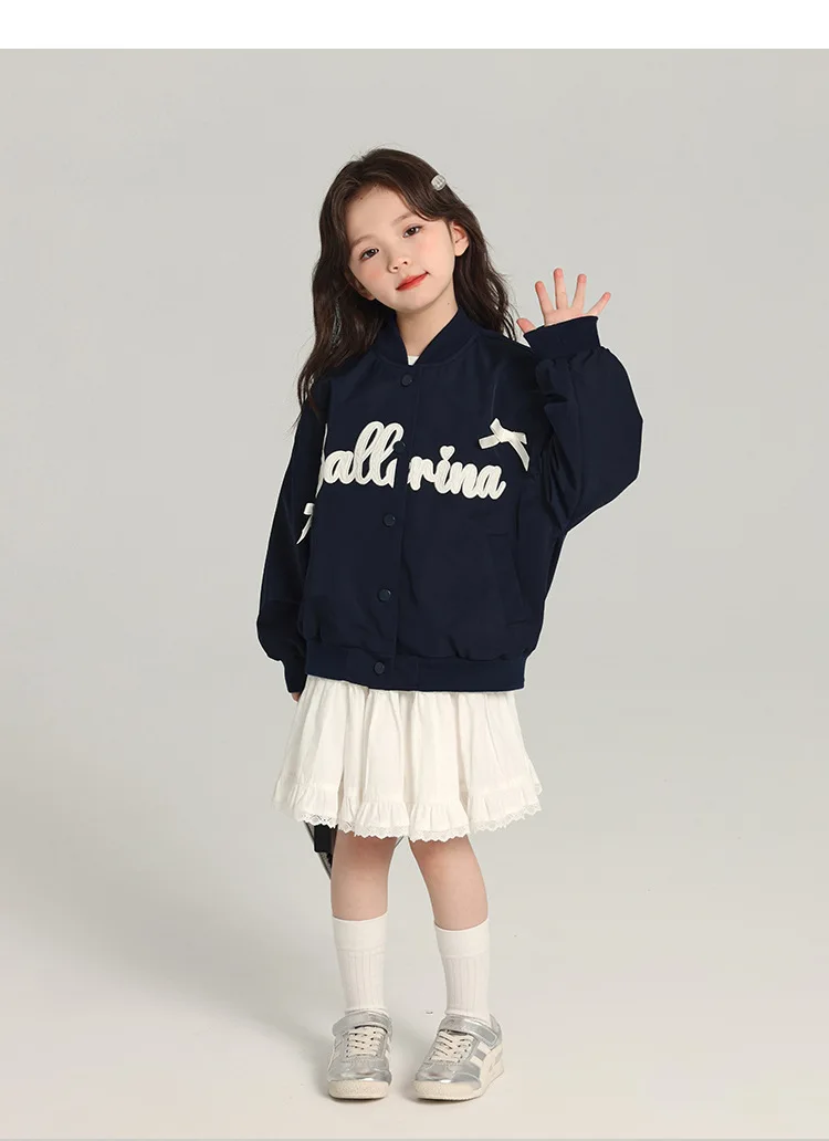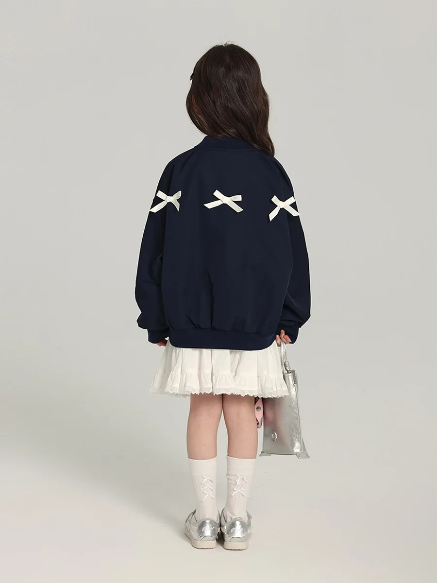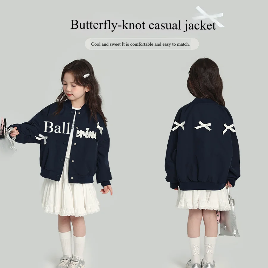 Girls Navy Blue Baseball Collar Casual Jacket Applique Embroidery Butterfly Knot Decor Customizable