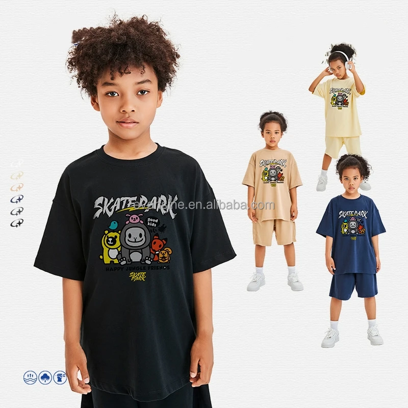 Customizable Kids Apparel Set 230g Cotton Short Sleeve T Shirt Shorts Happy Jungle Friends Animal Print Skatepark