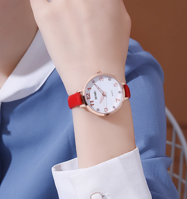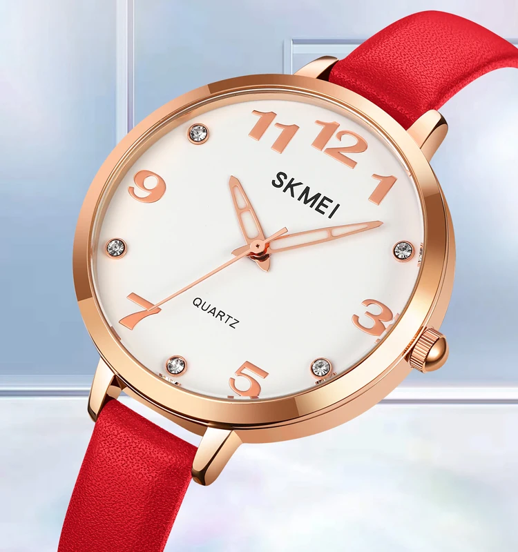 SKMEI 2028 Women's Simple Design Arabic Numbers Quartz Watch with Leather Strap 30m Waterproof Fashionable Lady's Wrist Watch