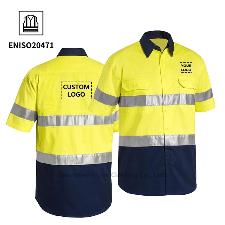 OEM Custom High Visibility Orange Mechanic Construction Mining Workwear Cotton Men Reflective Safety Clothing Hi Vis Work Shirt