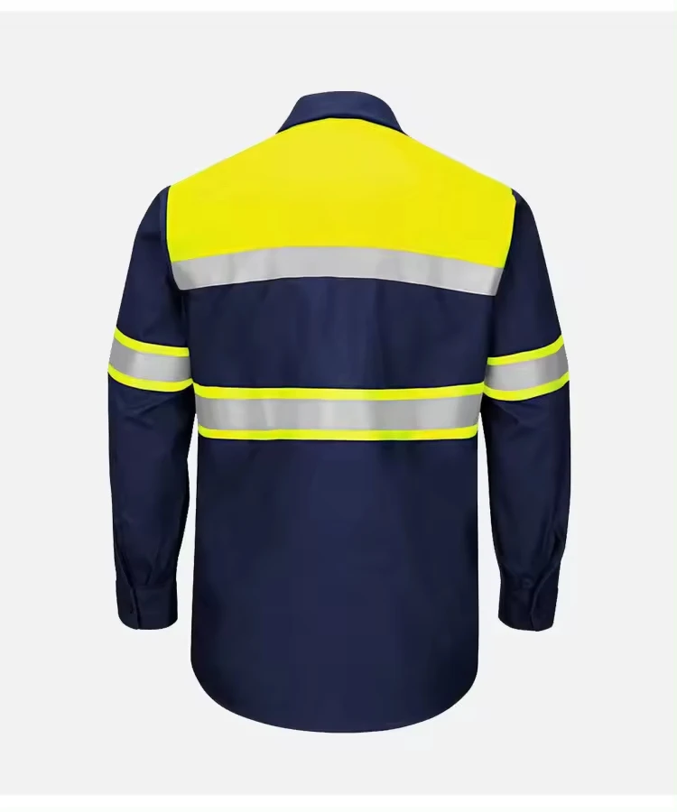 Two Tone Industrial Mining Construction Work Shirt Reflective Workwear 100% Cotton Yellow Navy Safety Shirts With Hi Vis Tapes