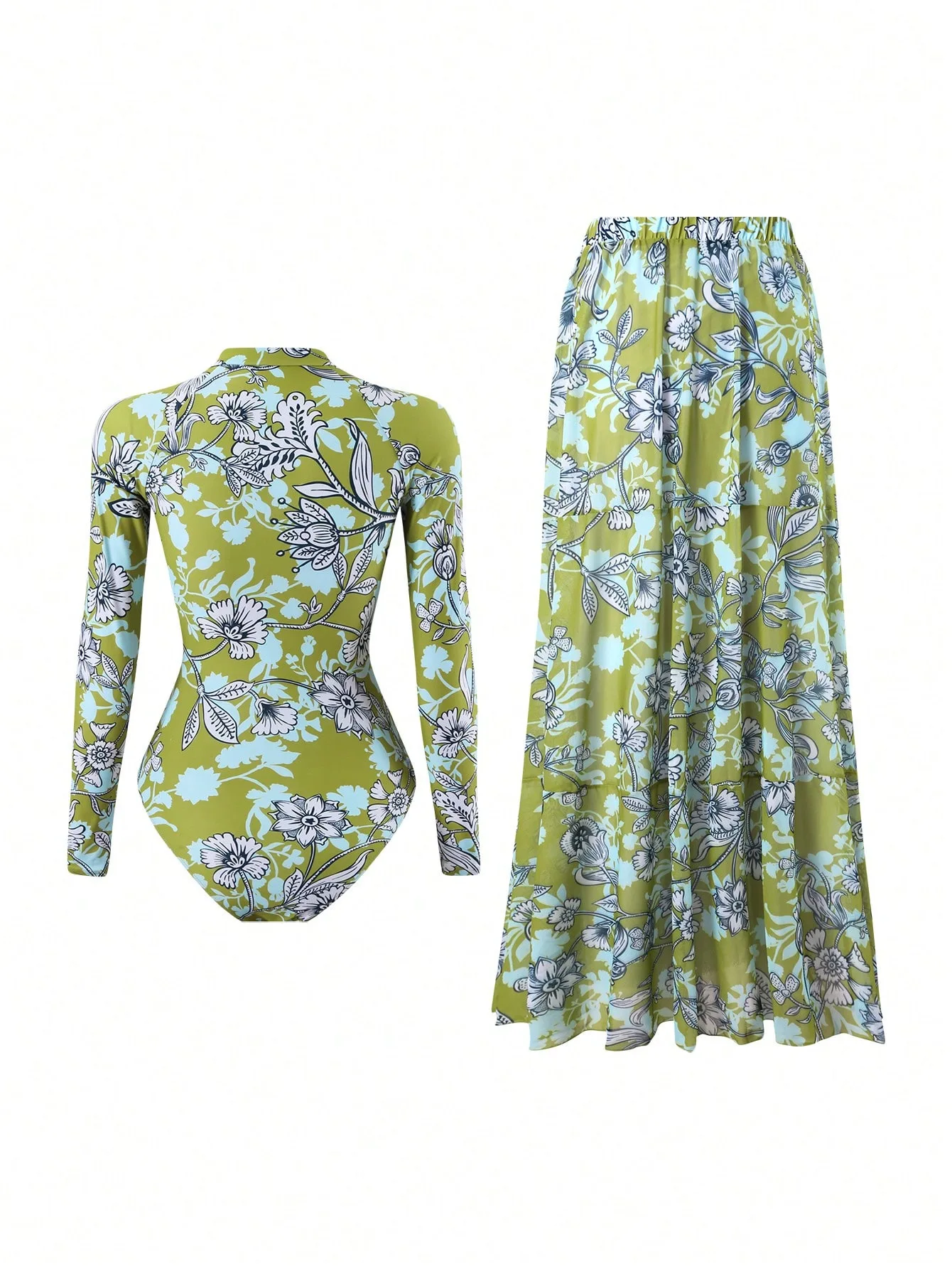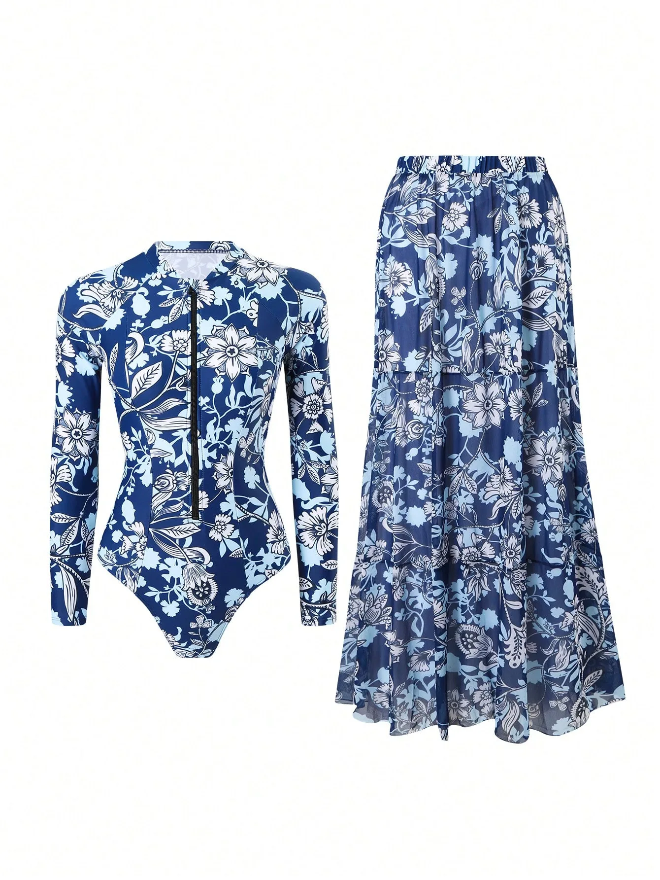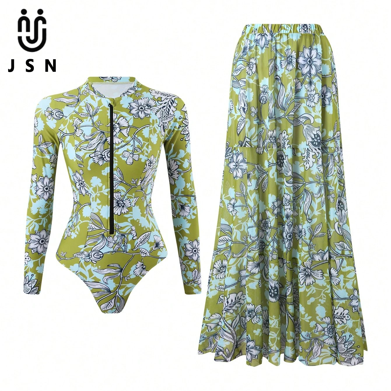 JSN 2026 New Design Printed Two-Piece Swimsuit Set for Women Long-Sleeved Zipper Quick-Drying Resort Swimwear with Swimdress