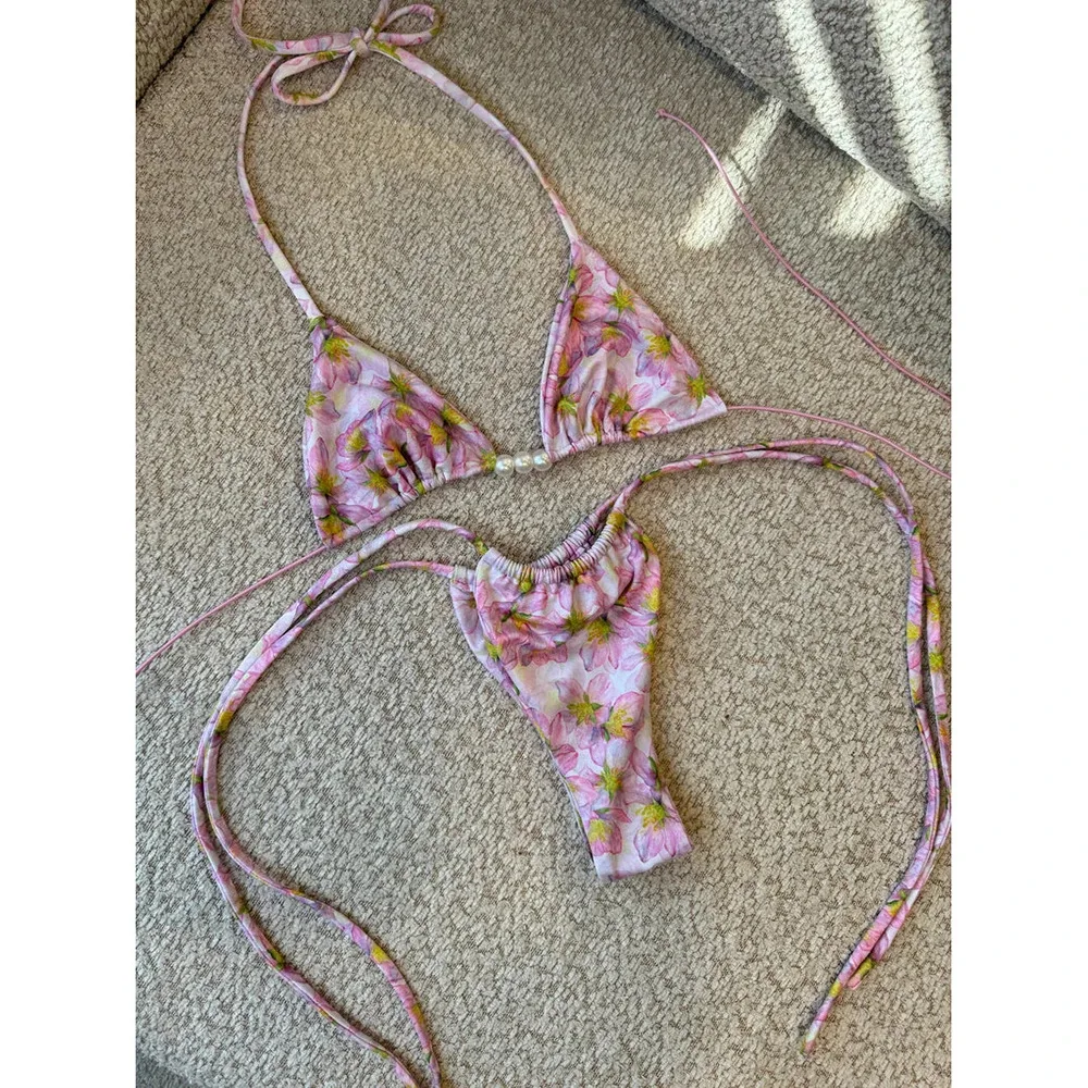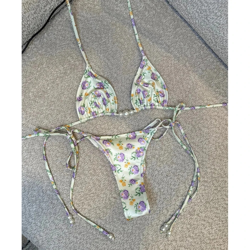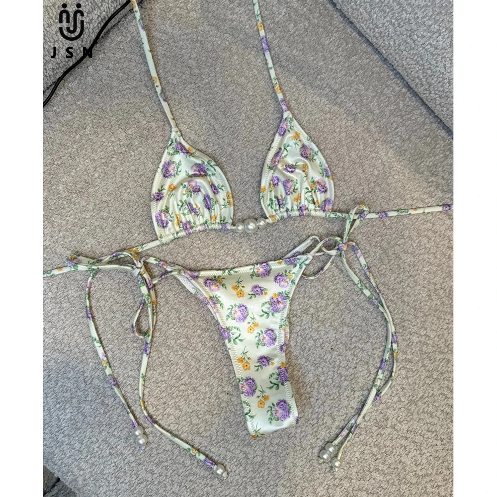 JSN 2026 New Design Women's Sexy Floral Printed Pearl beading two piece thongs Bikini Set halter backless fashionable swimwear