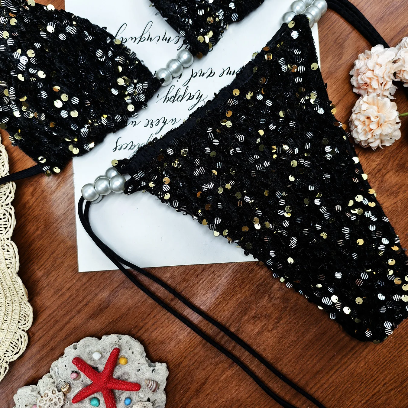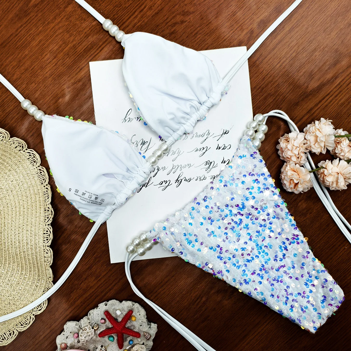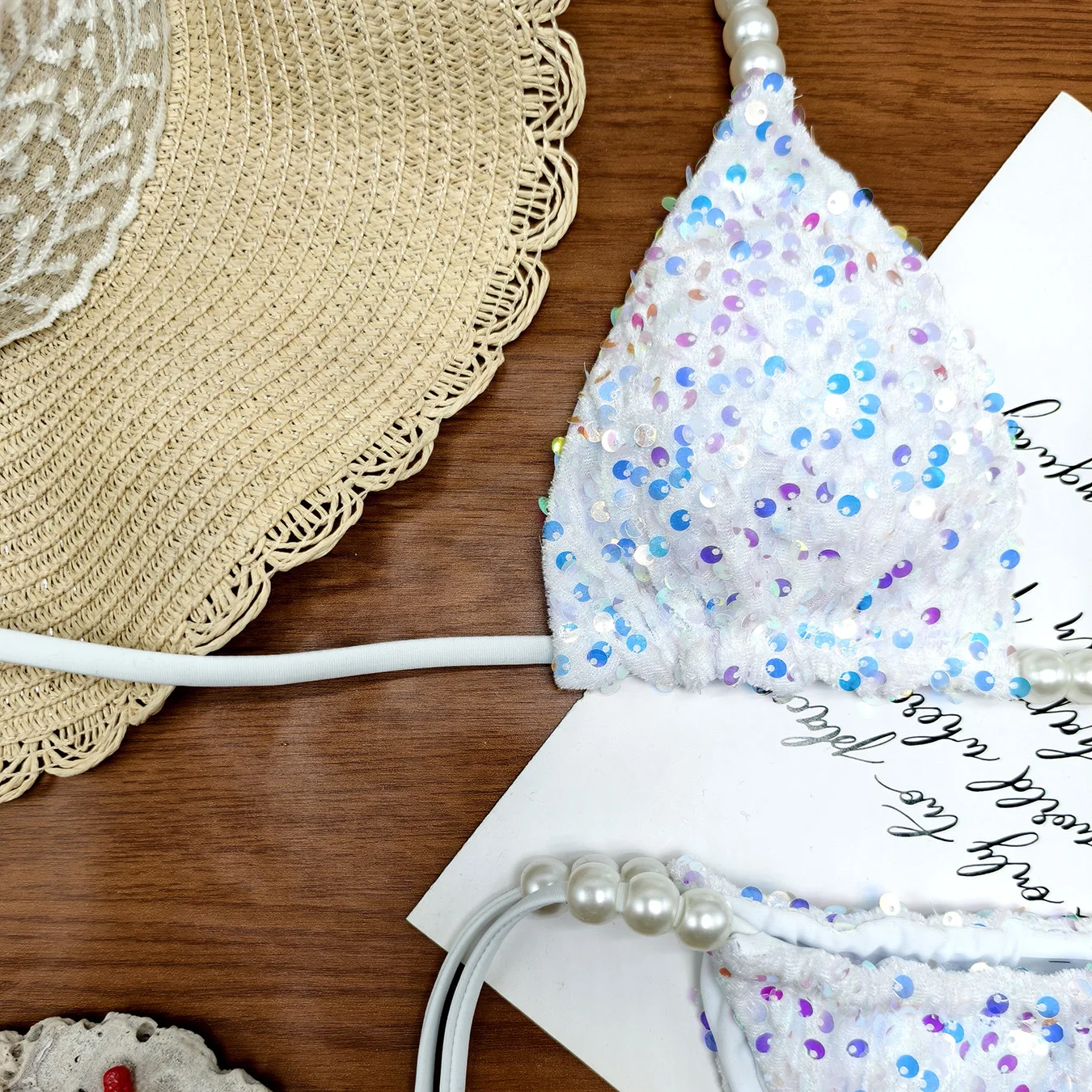 JSN 2026 Customized New Gradient Sequined Strap Two-piece Bikini Fashionable Swimwear Beach Vacation Backless Pearl Swim Suit