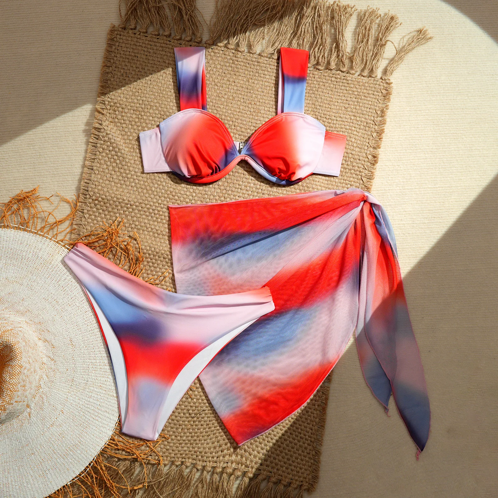 JSN 2026 Customized New Design Patchwork Three Piece Set Bikini with Skirt Women's Halter Push up Swimsuit Fashionable Swimwear
