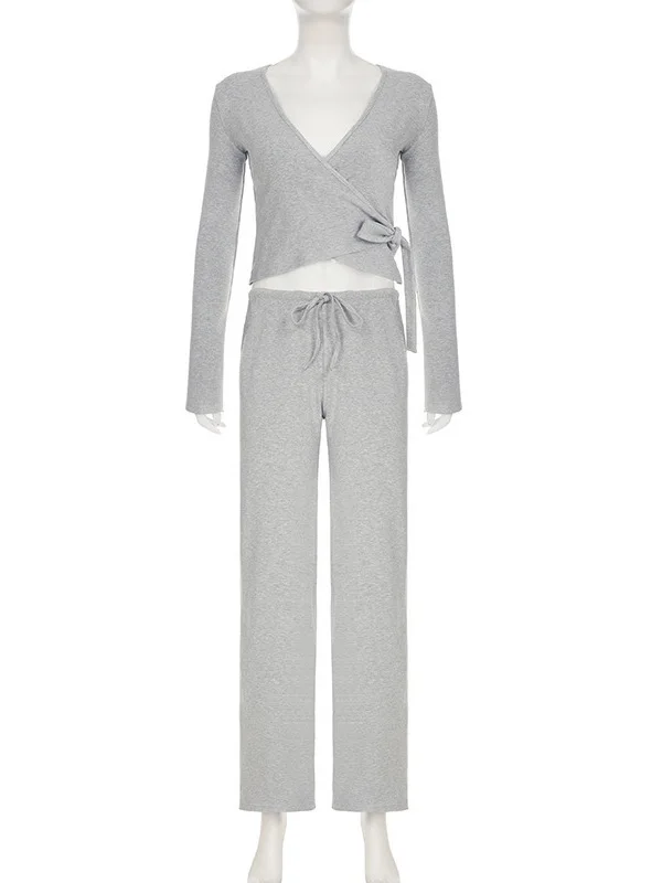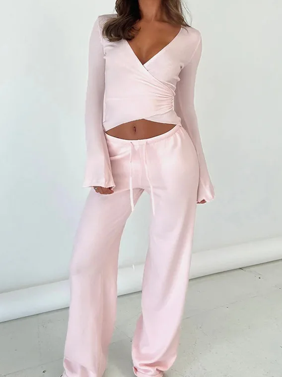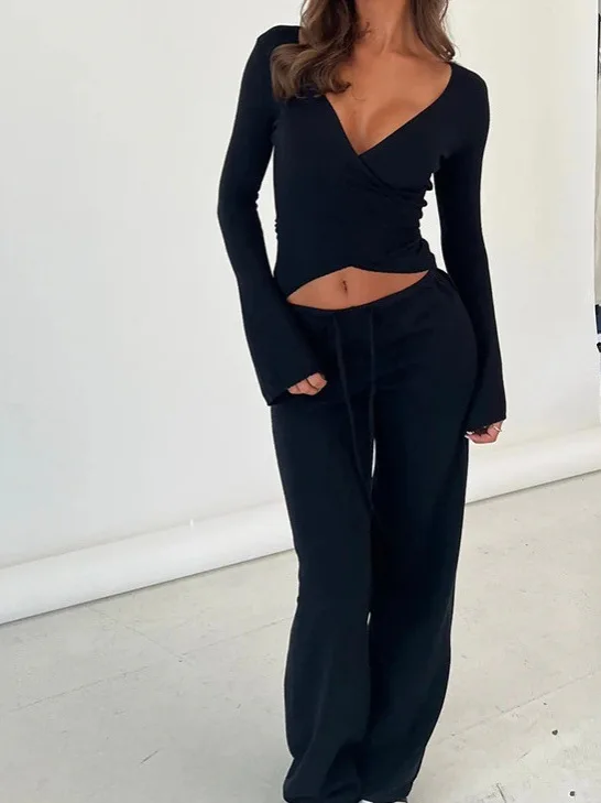 Winter New Sweet Comfortable Solid Color Deep V Slant Placket Long Sleeve Strap Top Drawstring Straight Pants Knitting