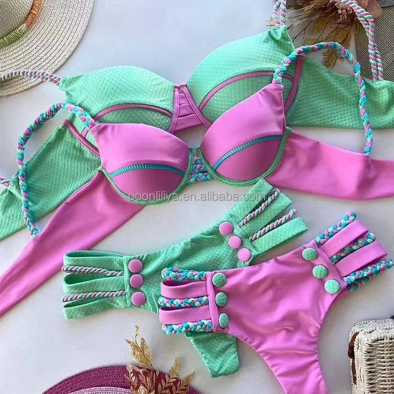 Swimwear Manufacturers Private Label 2026 Braided Straps Button Underwire Women's Bikini 2-Piece Set Spandex/Polyester Beachwear