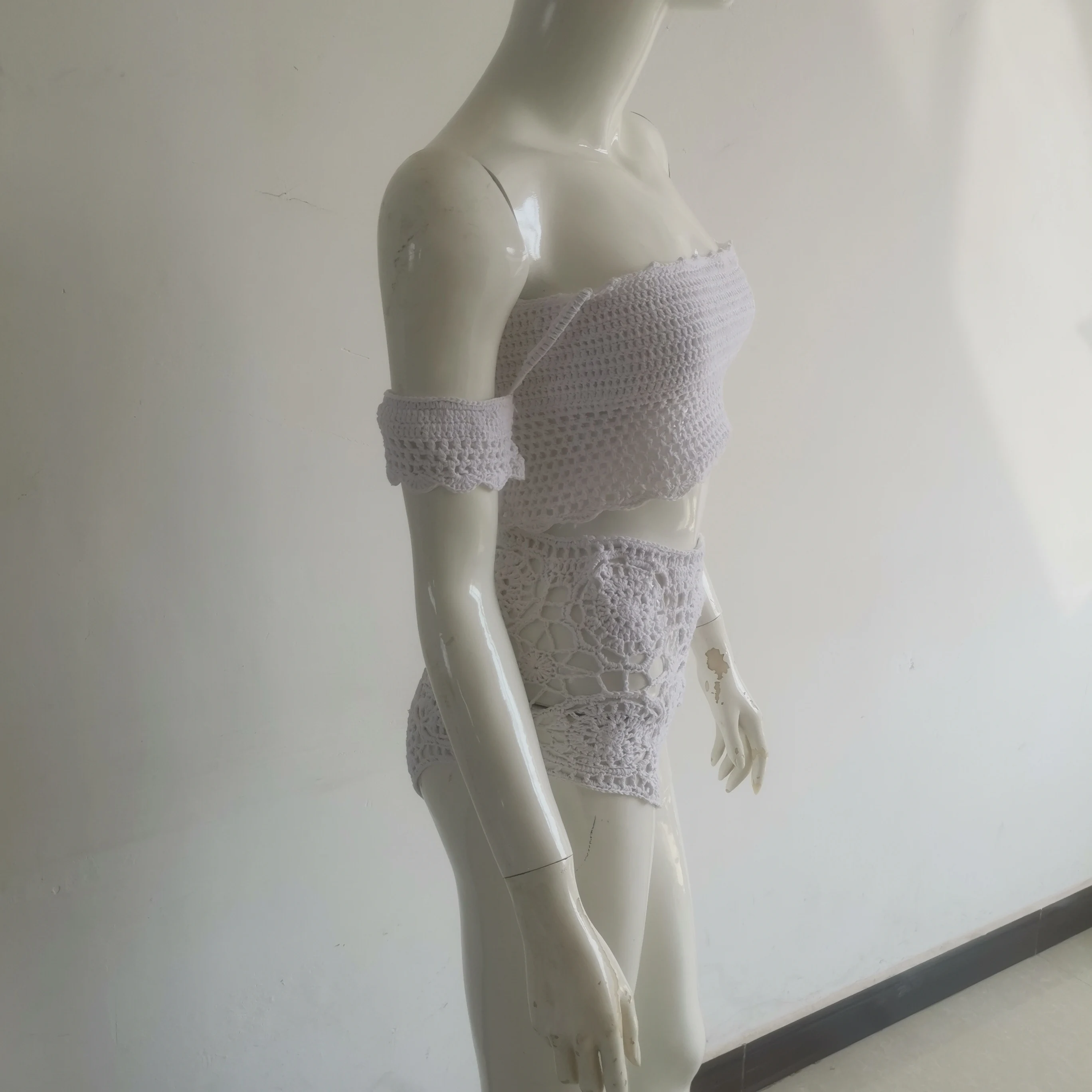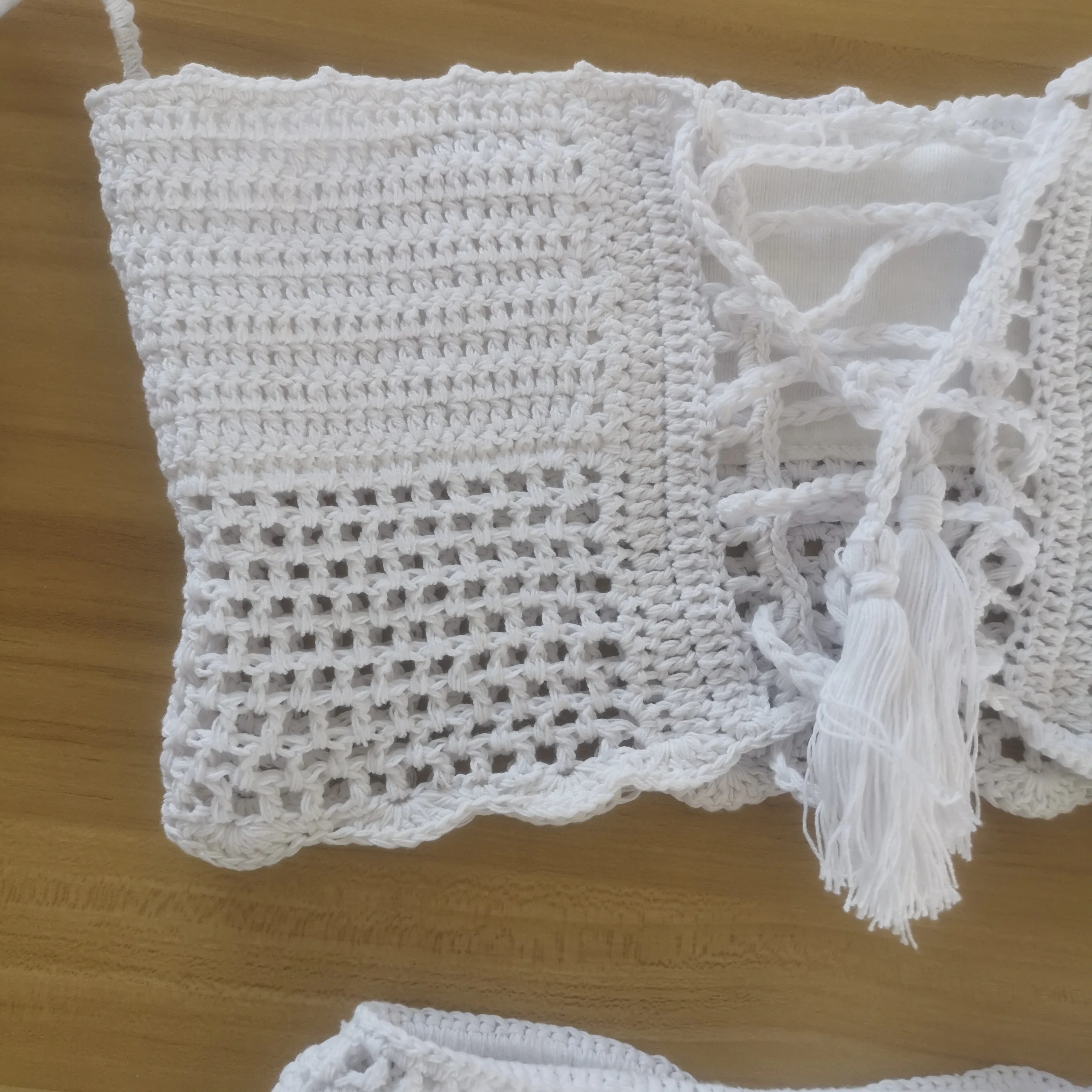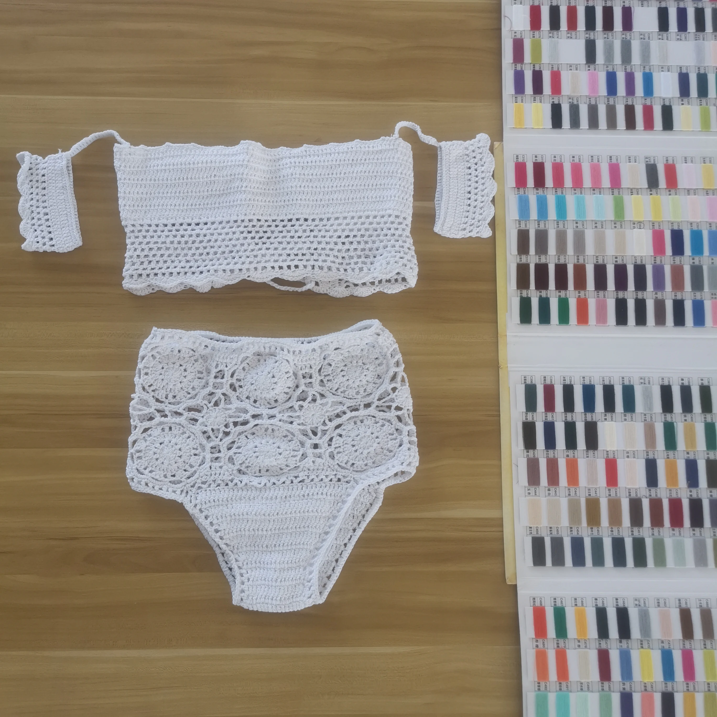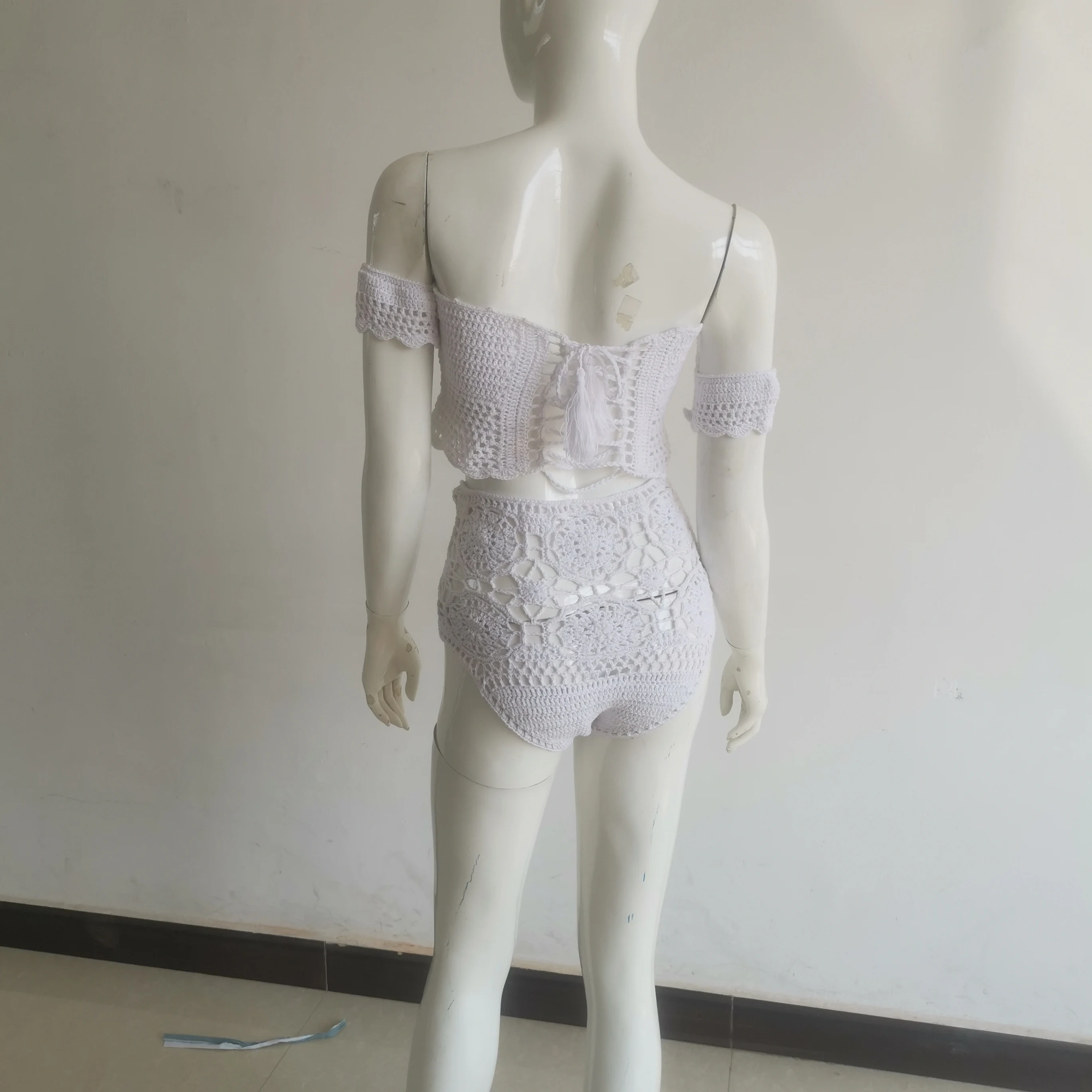 OEM Factory Customized Logo Crochet Swimwear for Women High Waist Cutout Print Handmade Sleeve Plus Size Sets Tassel 2-Piece Set