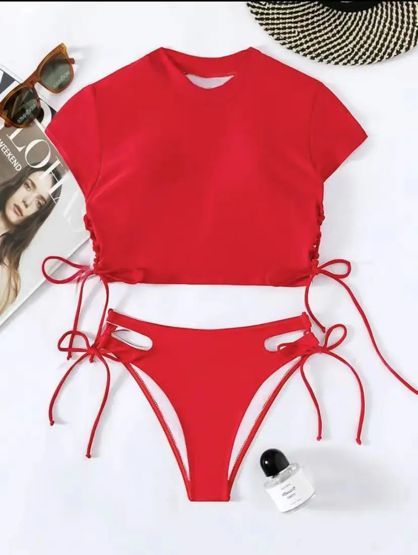 New Solid Color Sexy Bikini Adults Swimwear Bikini High Waisted Sexy Short Sleeve Bikini Set