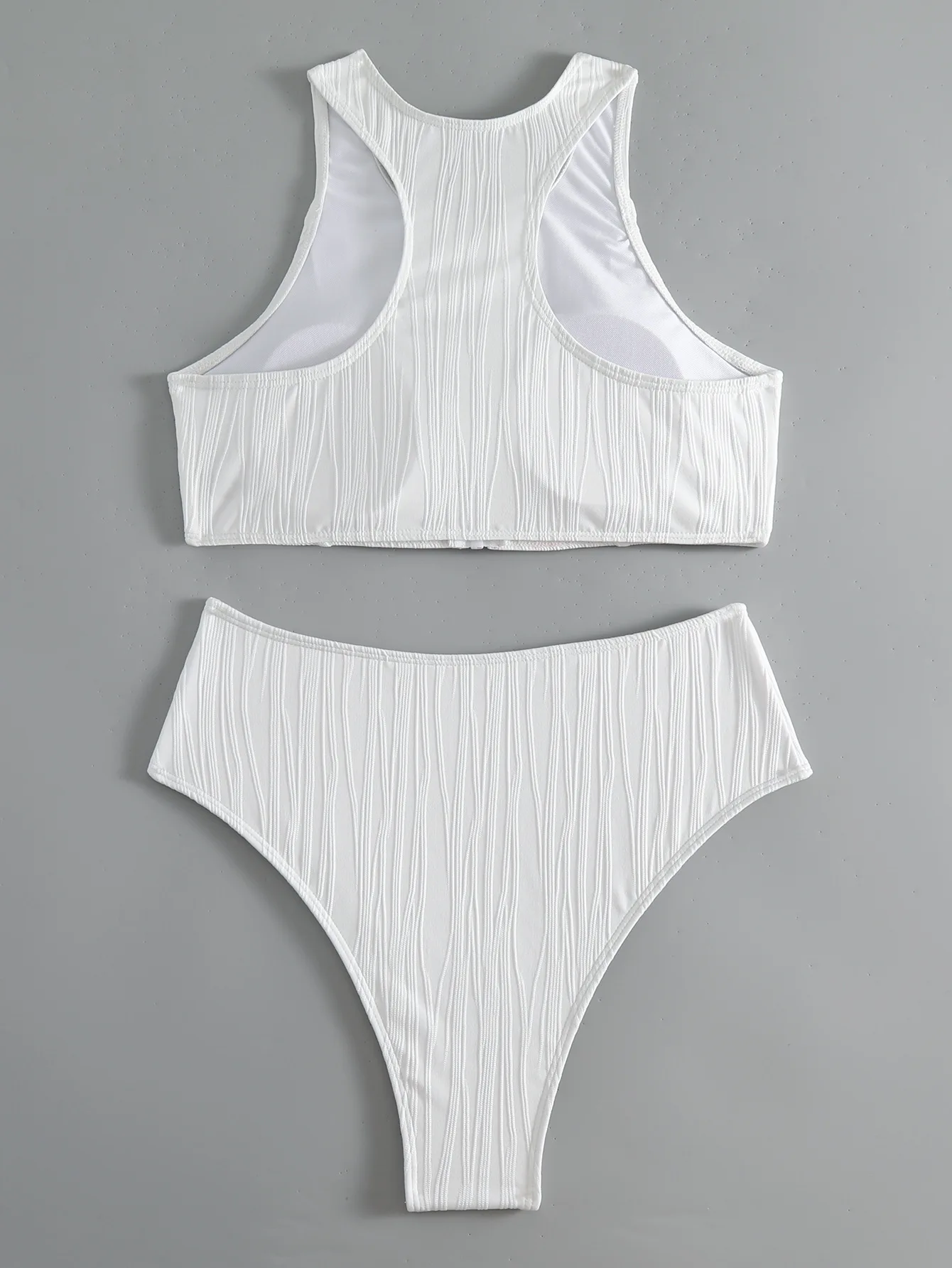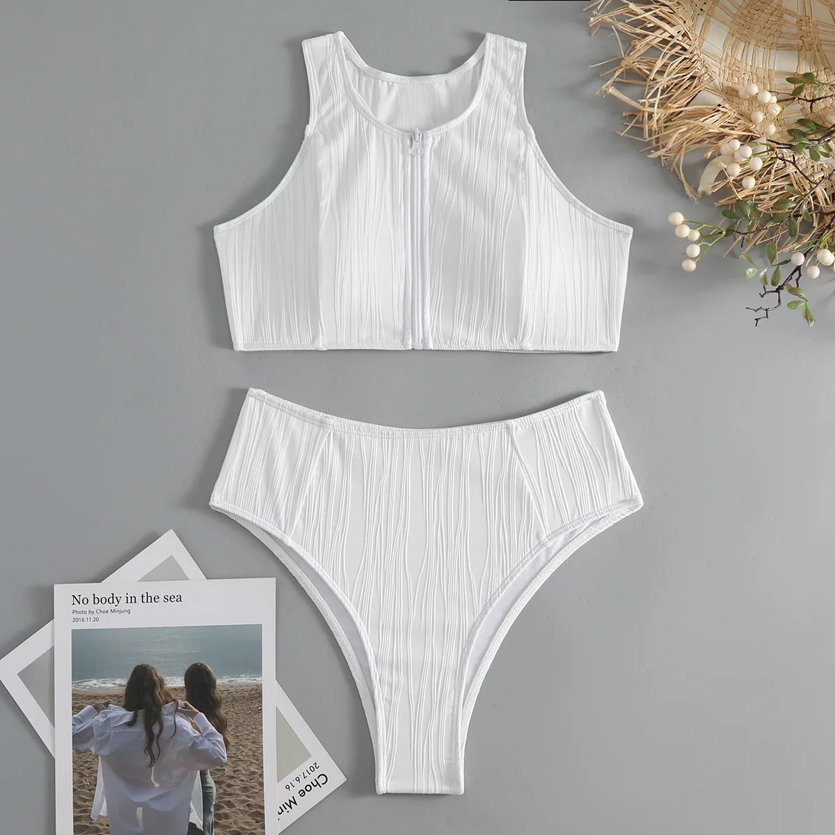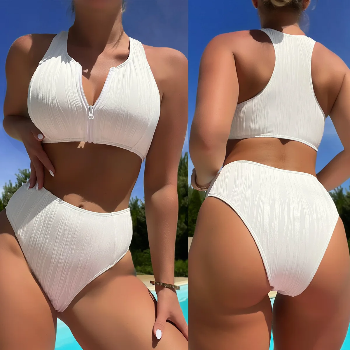 Women's High Waist Zipper Front Swimwear Beachwear White Bikinis