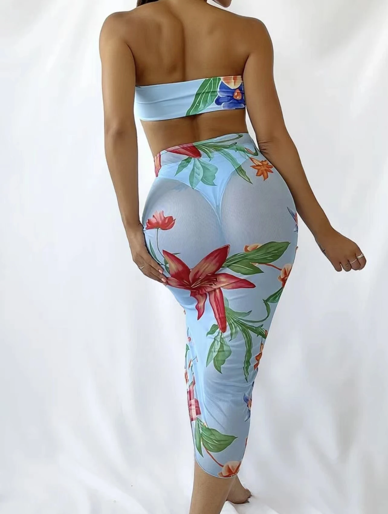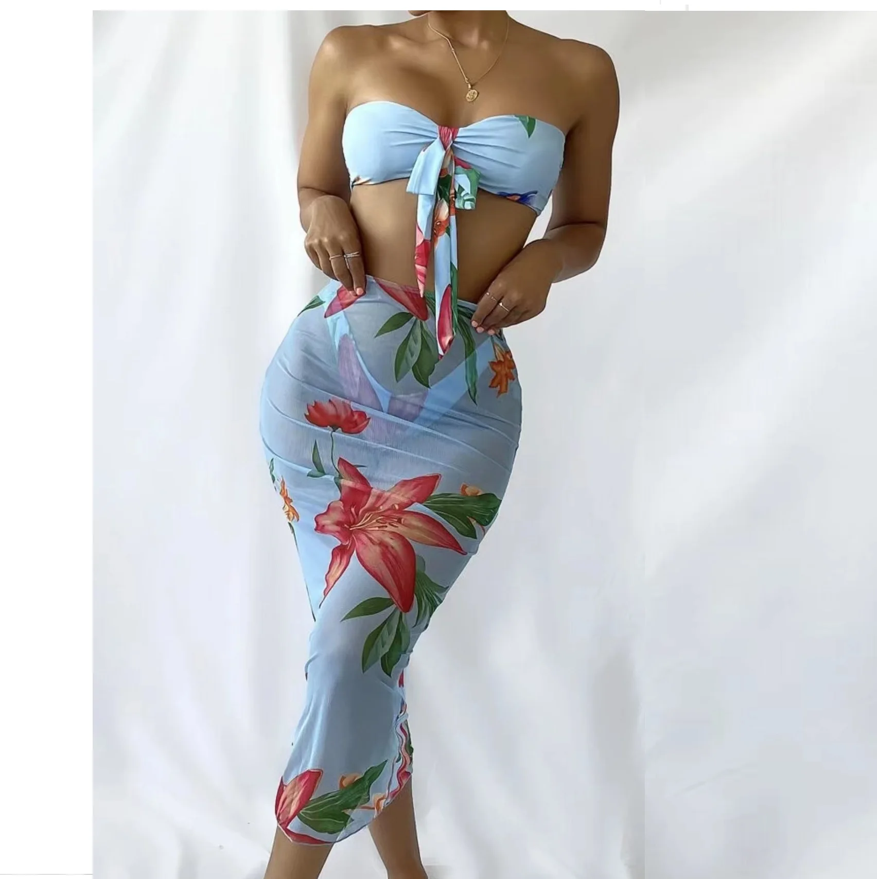 High Quality 3pcs Set Sexy Strapless Straight Bikini Bandeau Long Sexy Swimwear for Women Adult White Crochet Bikini