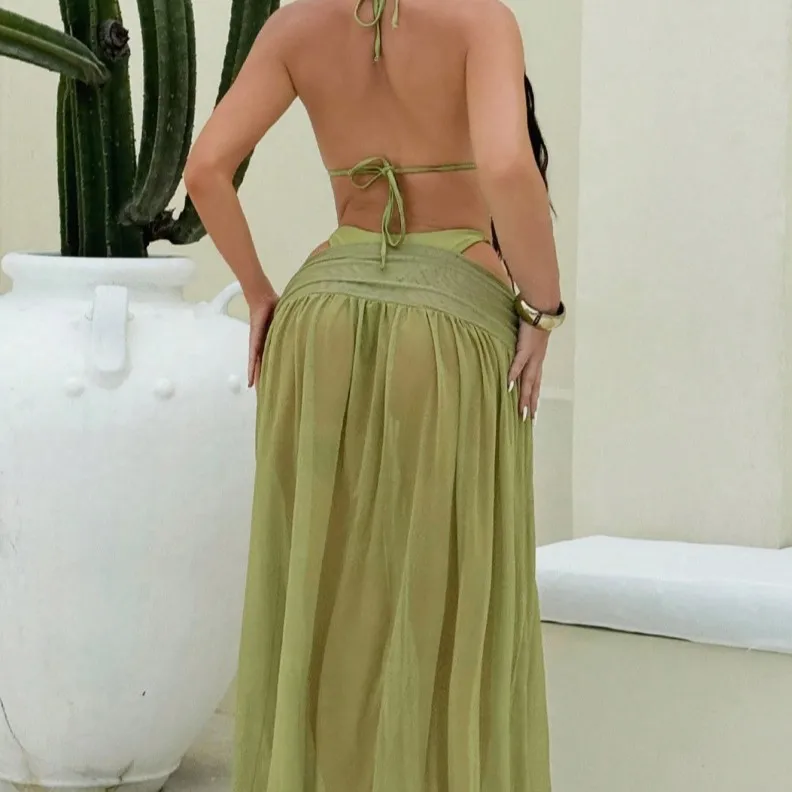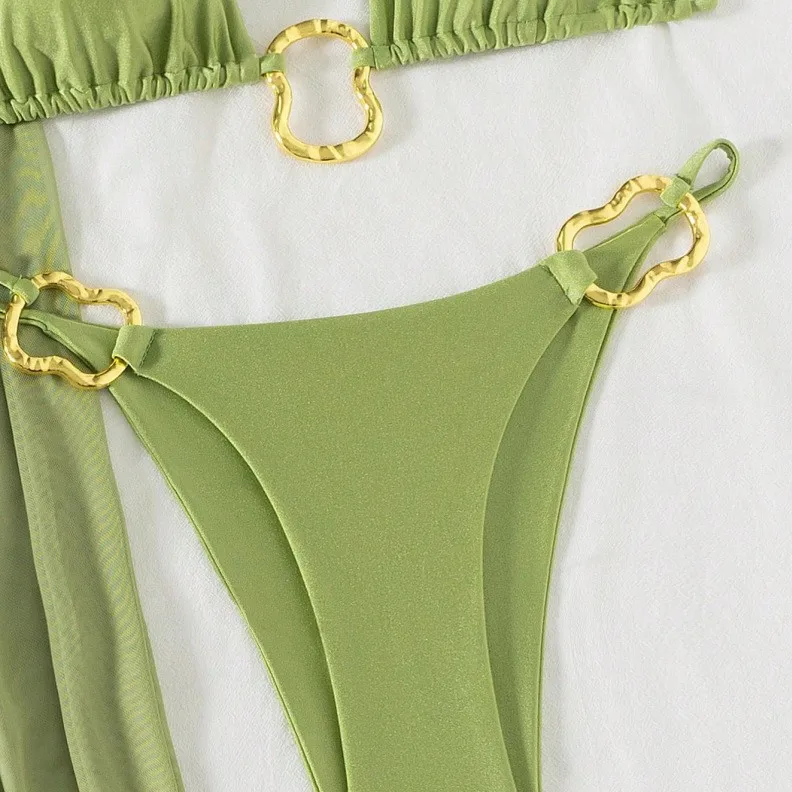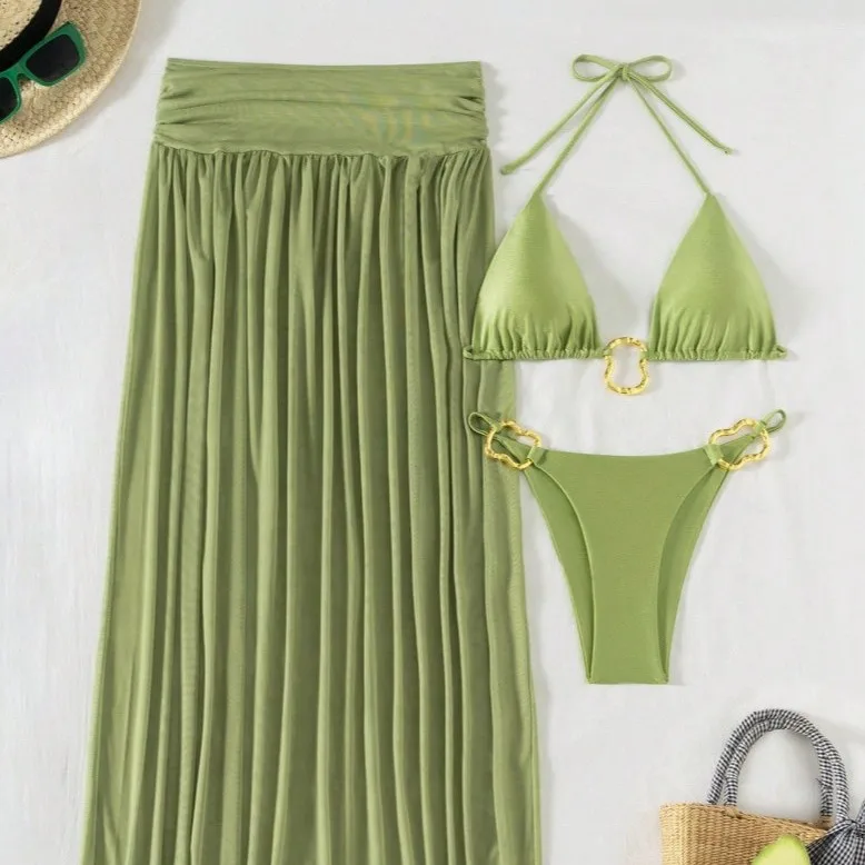In-stock Women's 3-piece Swimsuit Set: Triangle Top, Brazilian Bikini Bottoms, and Skirt/mesh Beach Cover-up. Sizes S-XL