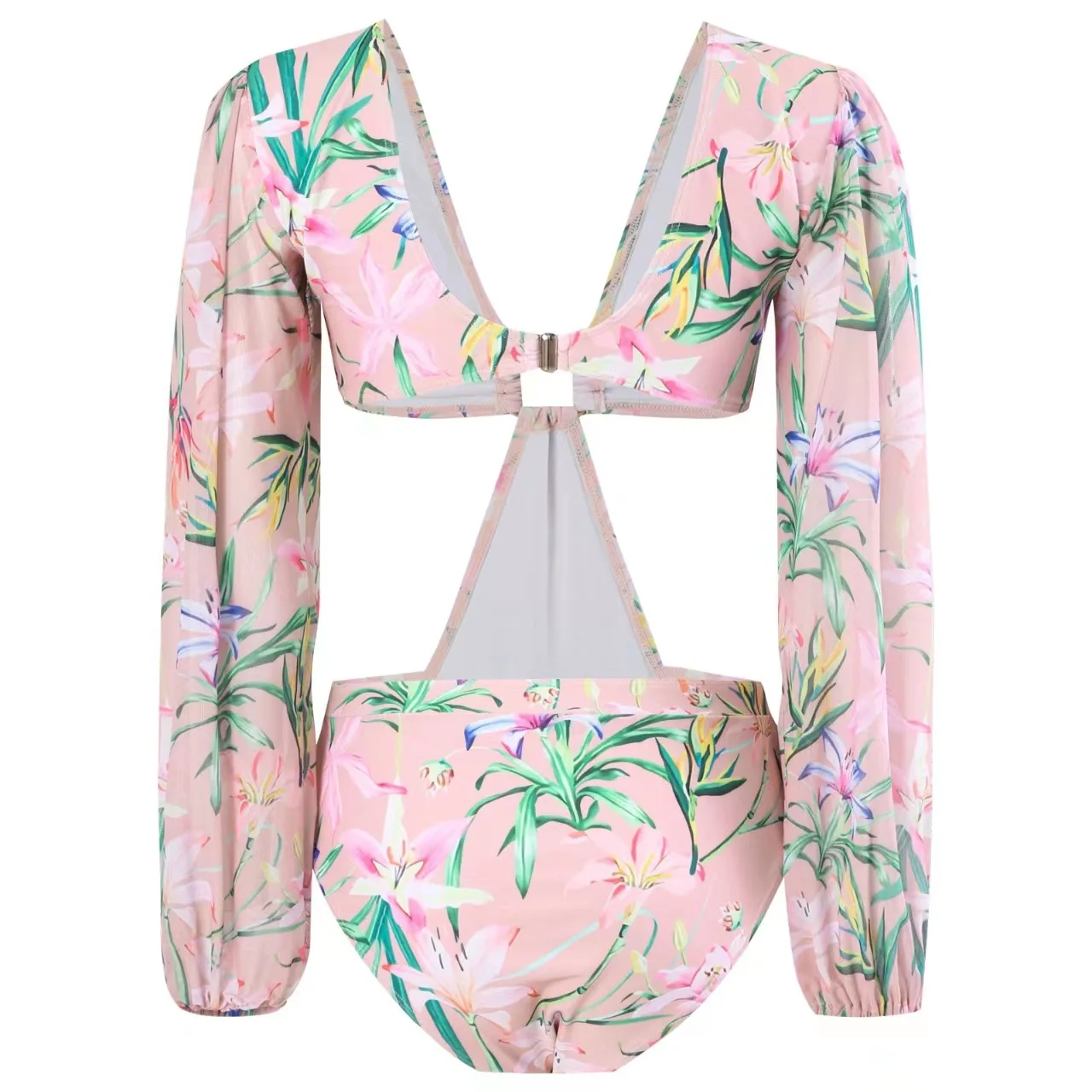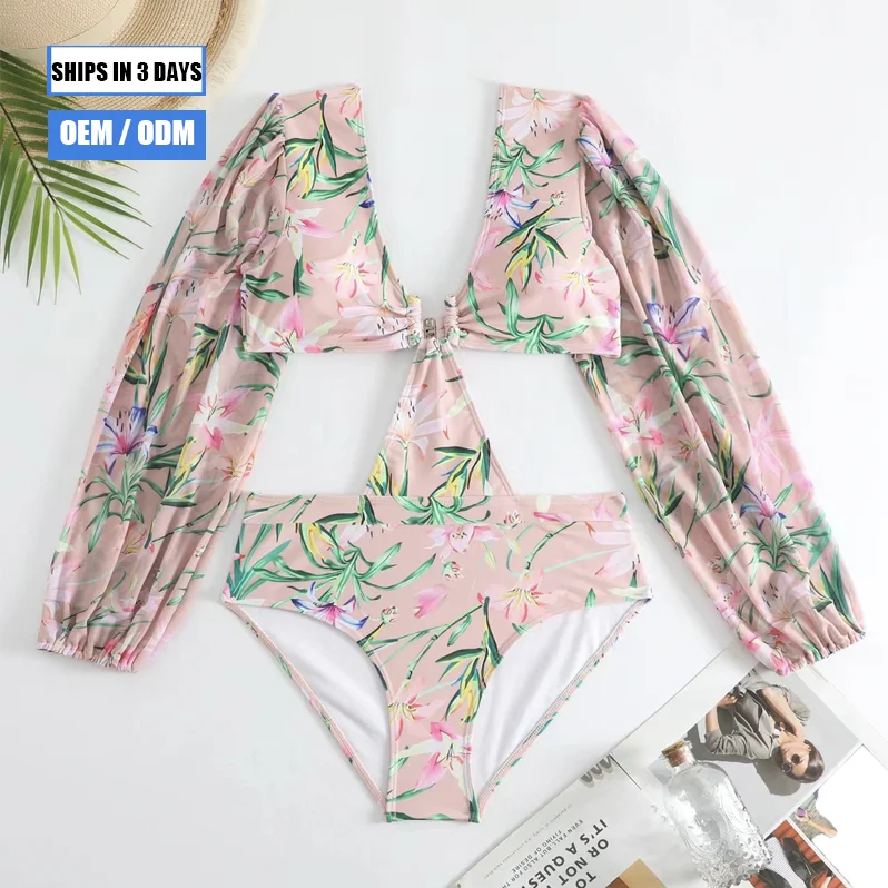 Custom Handmade 2-Piece Set Swimwear Beachwear Floral French Retro One-Piece V-neck Swimsuit Skirt Front Logo Quick Dry Stretch