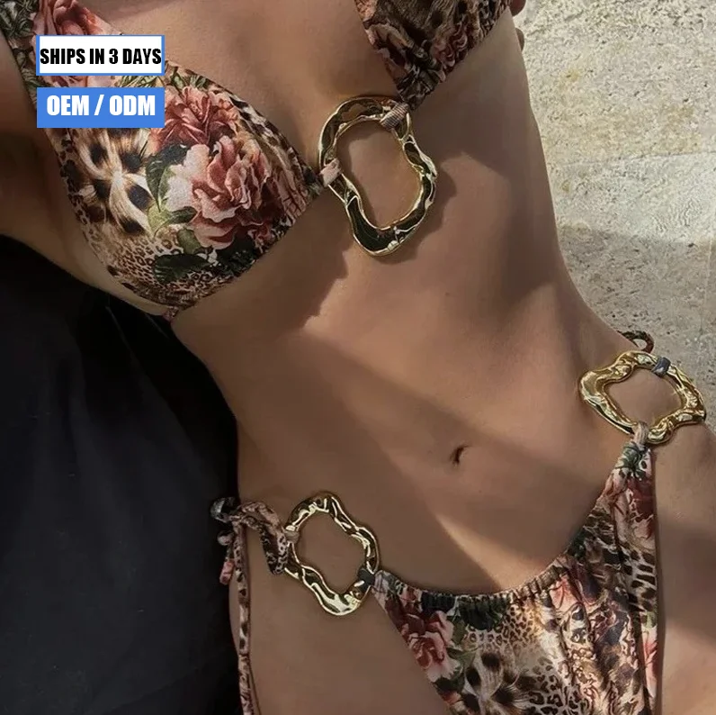 2026 Custom Sexy Leopard Print Strap O-Ring Metal Two-Piece Swimsuit 2026 New Elegant Party Bikini Front Logo Eco-Friendly
