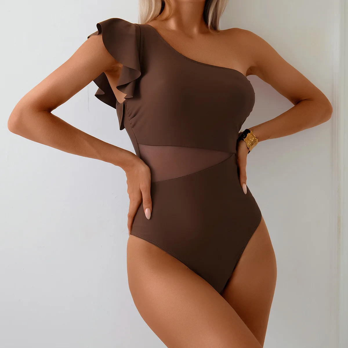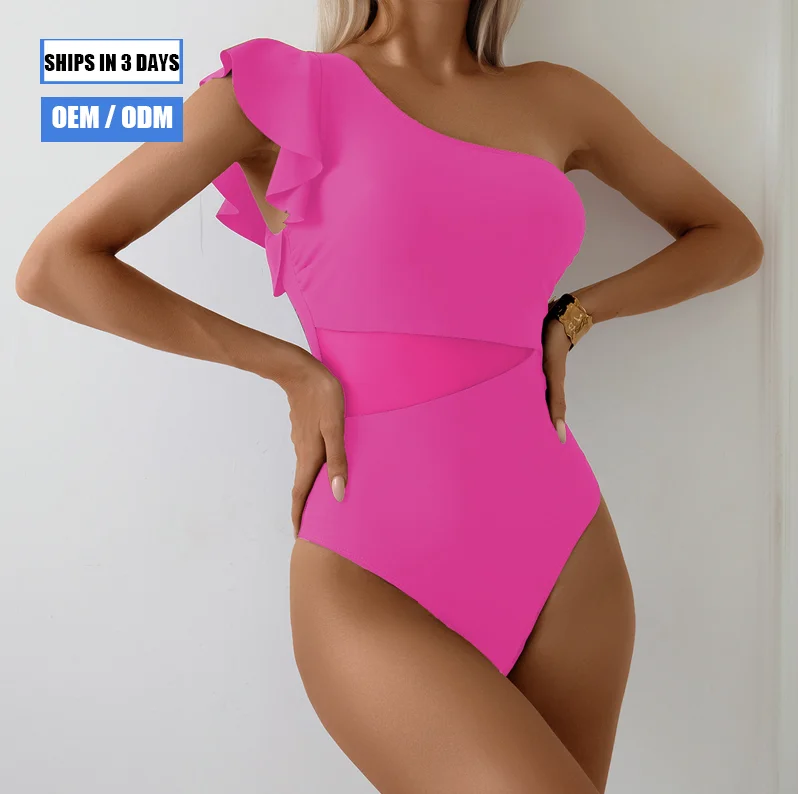 2026 One-shoulder Ruffled Women's One-piece Swimsuit, Brazilian Swimsuit, Transparent Mesh Insert Swimsuit, S-XL