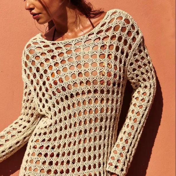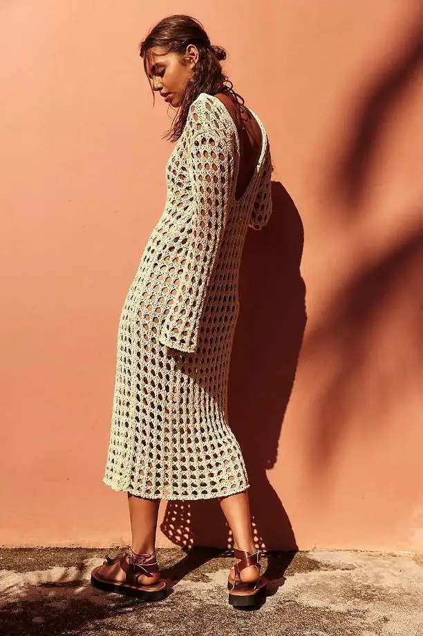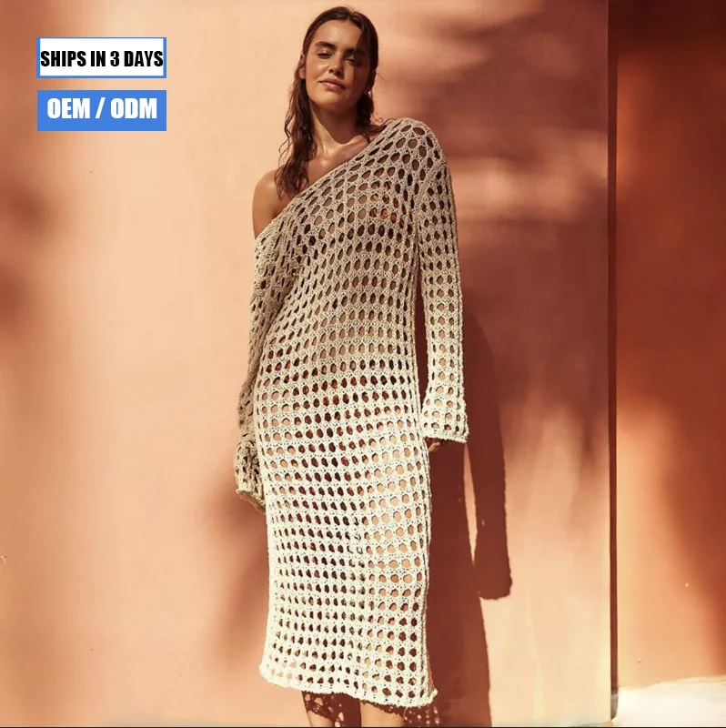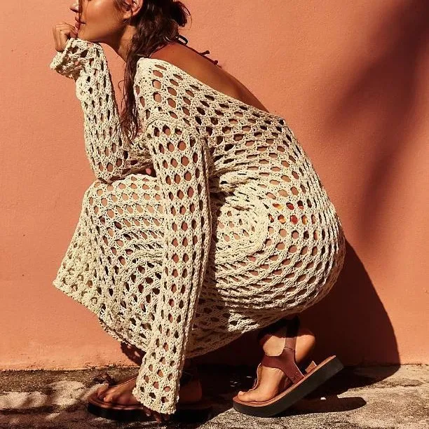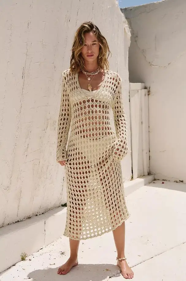 2026 Stock 3 Colors Long-sleeved Women's Crochet Dress, Openwork Cover-up, Maxi Dress, Knitted Beachwear