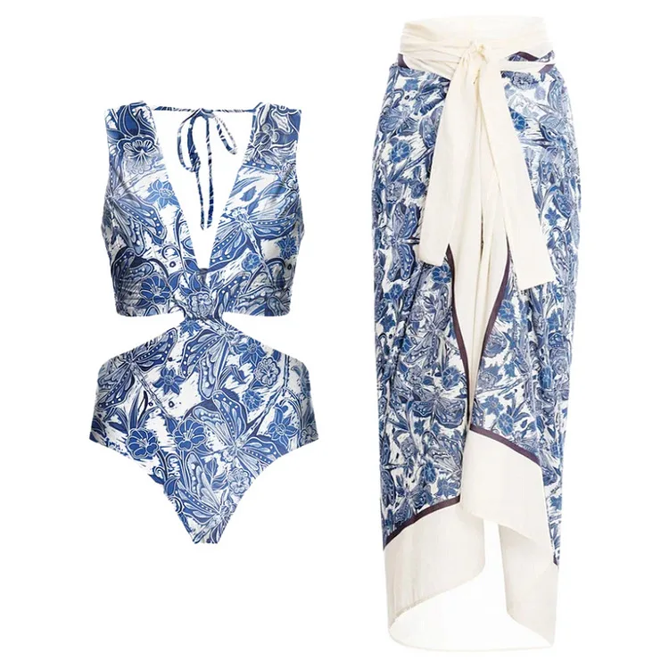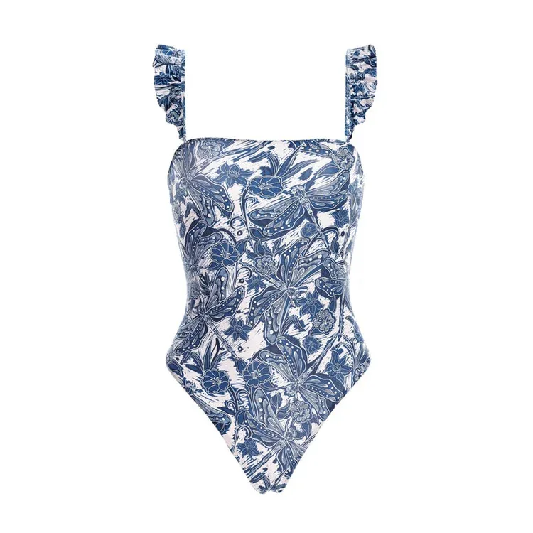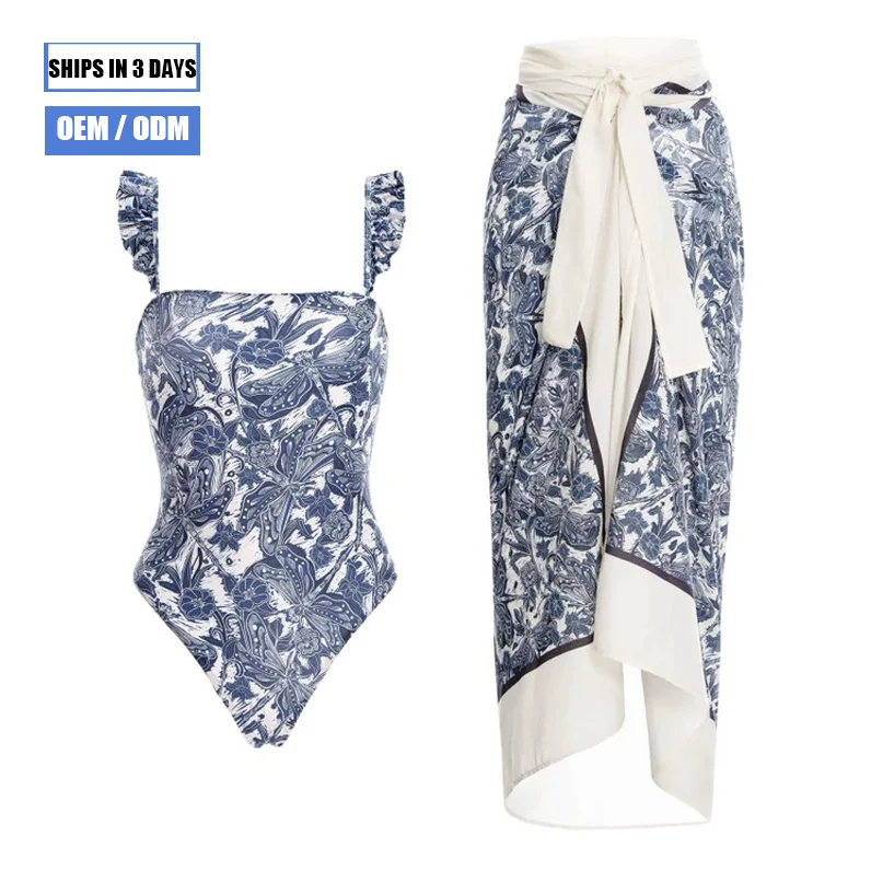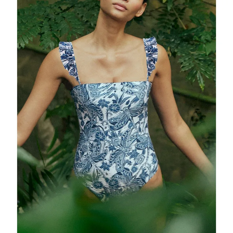 2026 New Women's Blue Printed Swimsuit and Covered Ruffled Belt One-piece Swimsuit Floral Swimsuit Beachwear