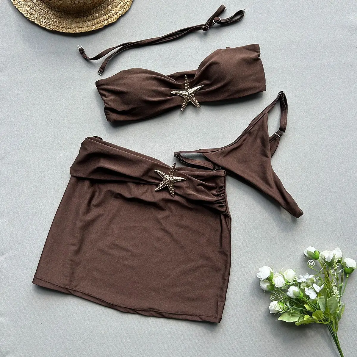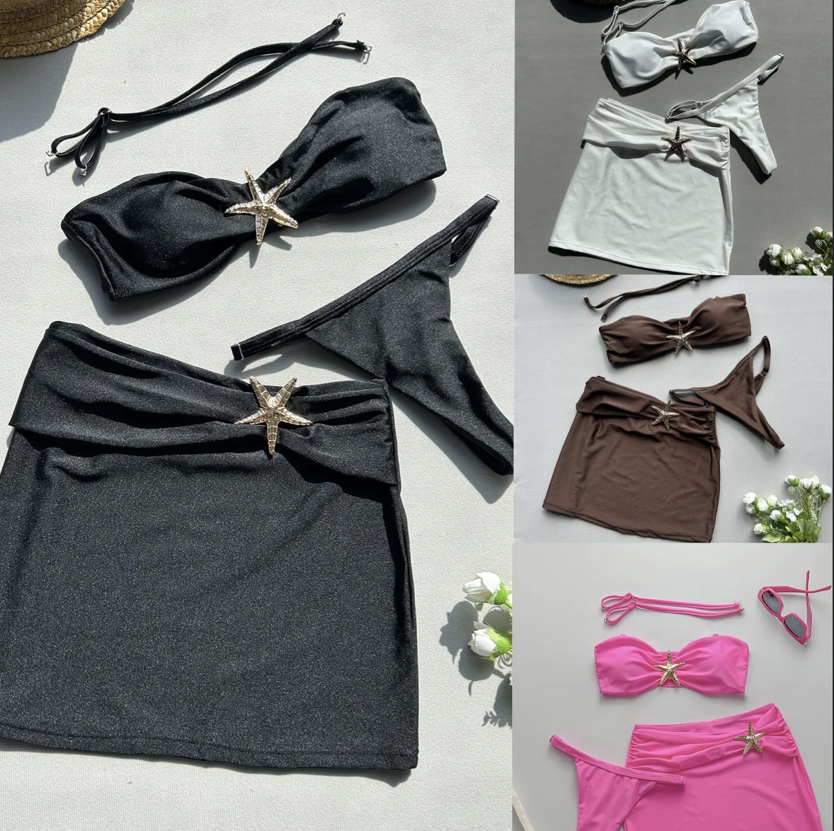 2026 New Bandeau Quick Dry Women's Beach Bandeau Asymmetrical Covered Women's Bikini 3-Piece Swimsuit Tulle Cover Skirt