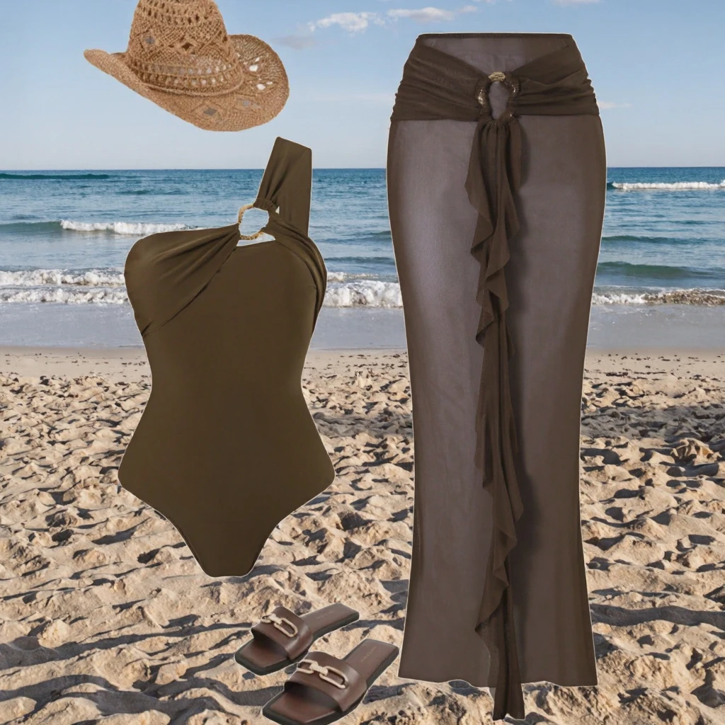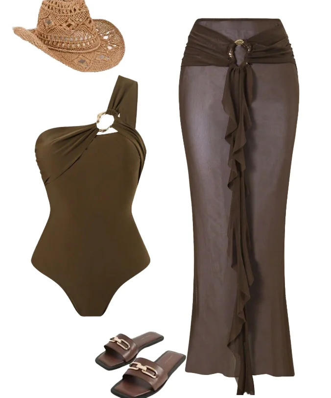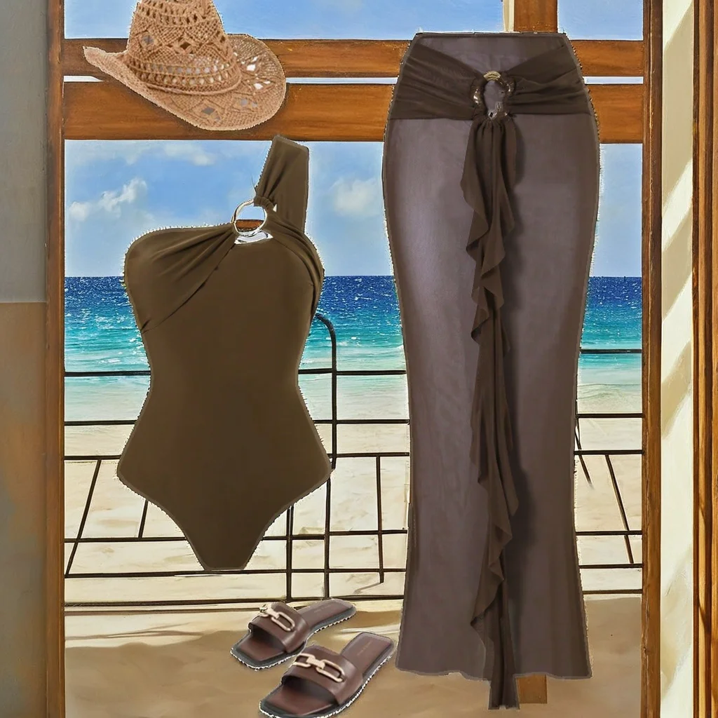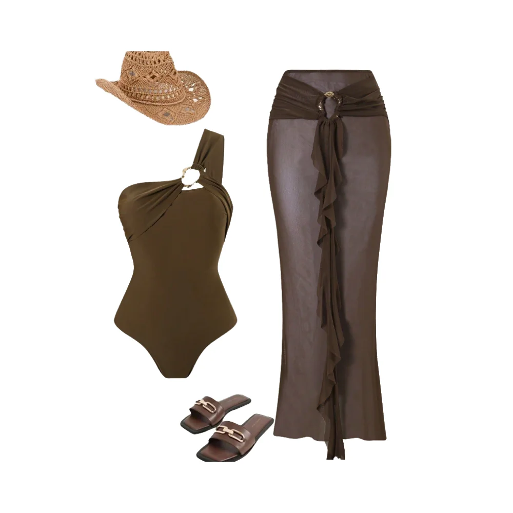 STOCK Two Colors Solid Designer Women Bandeau Two-Piece Swimwear One Shoulder Swimsuit Skirt Set Waist Logo Sheer Cover Ups 100%