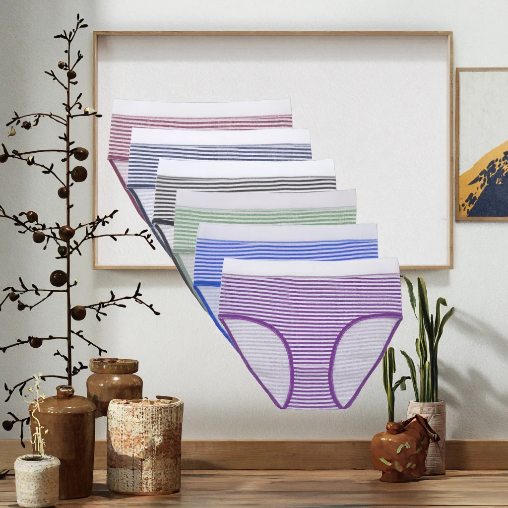 New Breathable Everyday Women Hipster Mid-Rise Knitted Cotton Japanese Cute Stripe Underwear Waist Cotton Gusset Seasonal