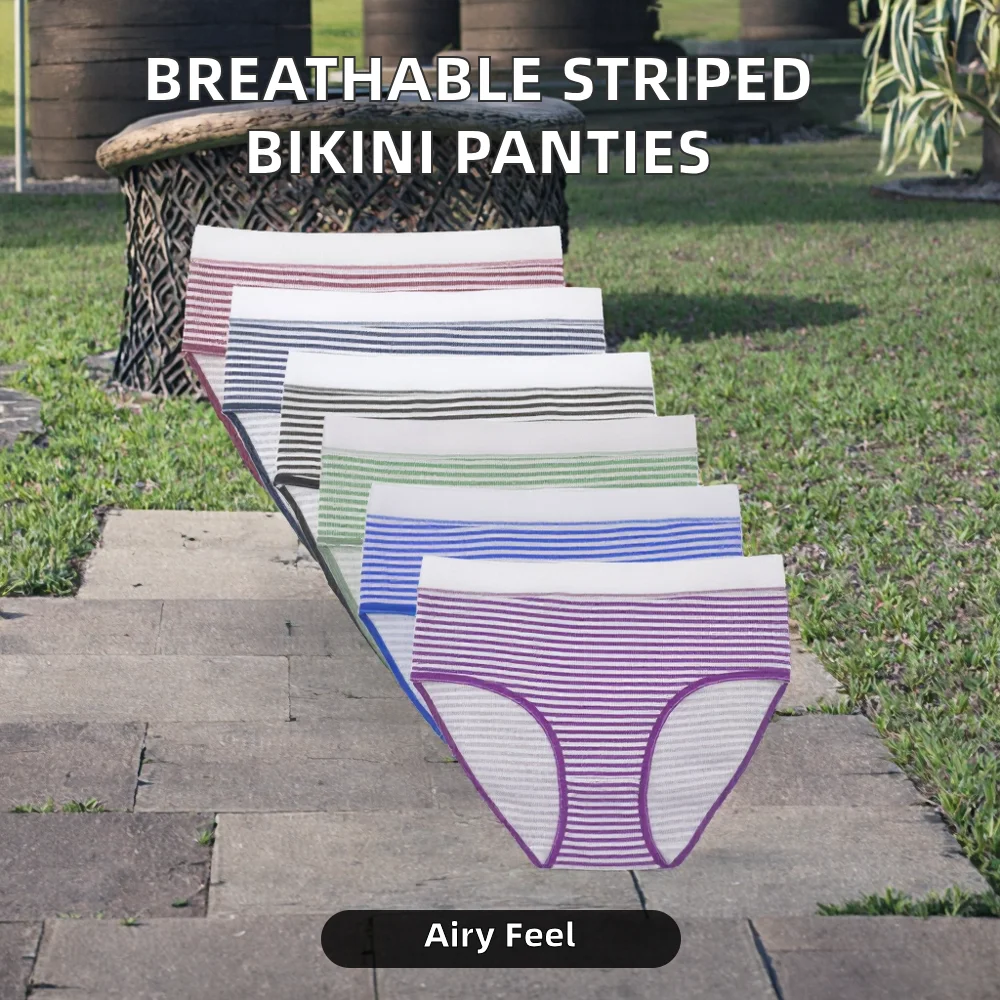 New Breathable Everyday Women Bikini Panties Mid-Rise Knitted Cotton Japanese Cute Stripe Underwear Waist Cotton Gusset