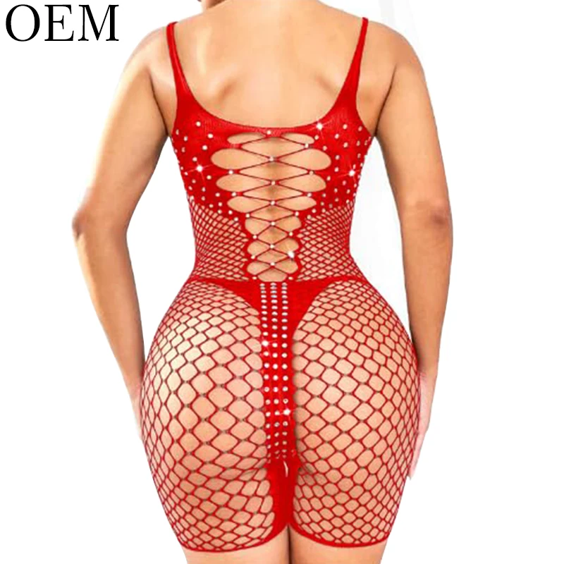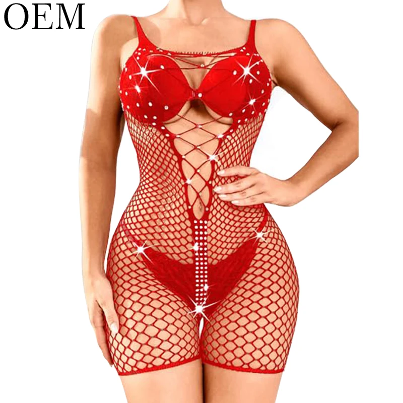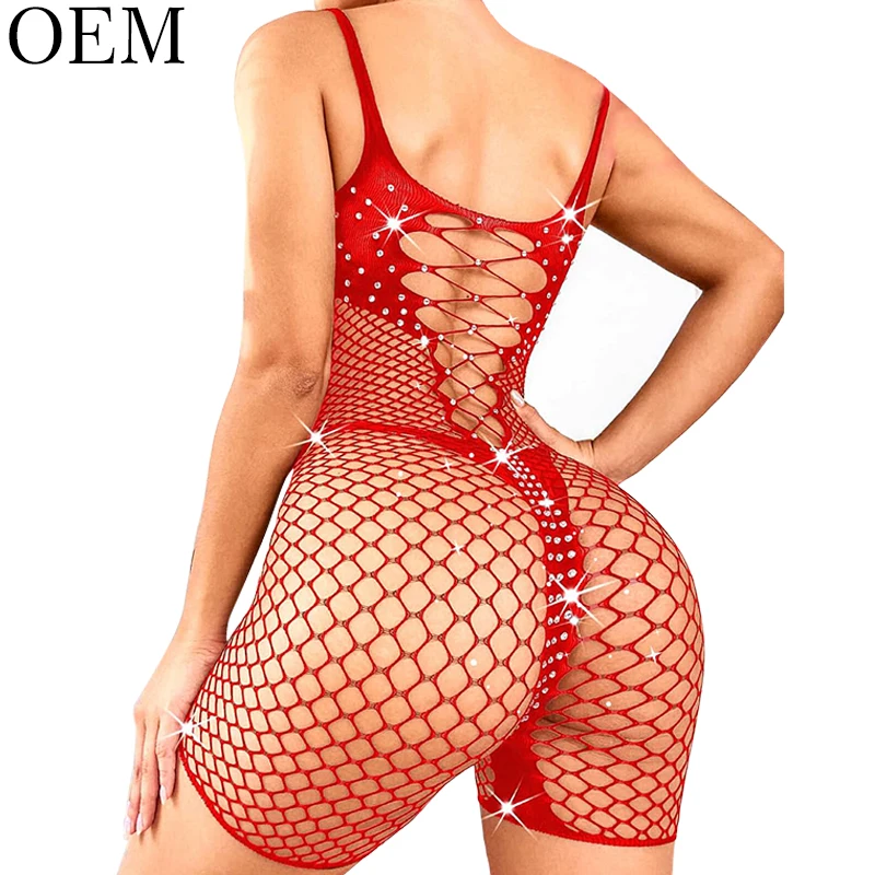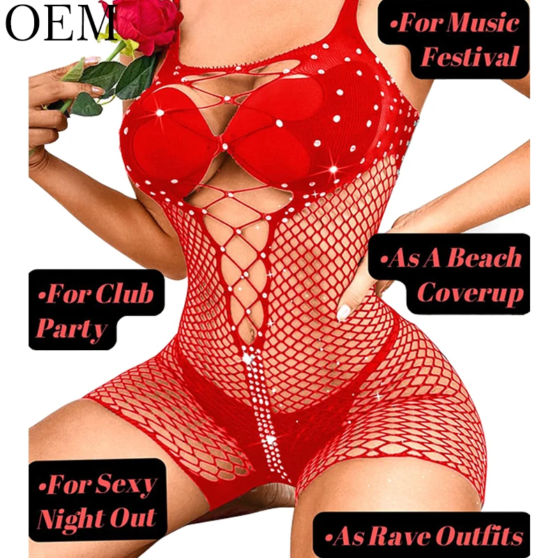 Sexy Rhinestone Embroidery & Ruffles Bodysuit Fishnet Rave Outfits Plus Size Jumpsuit Romper Bodystocking for Women Lingerie