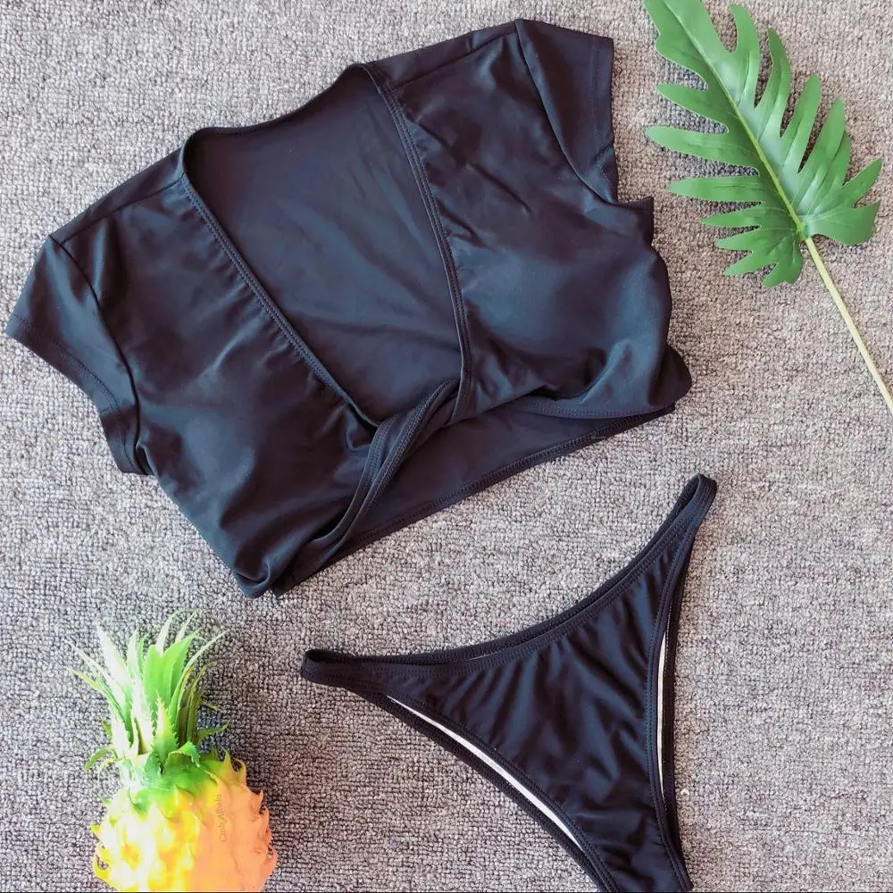 Fashion Women Spandex Scrunch Butt Push up White Short Sleeve High Waist Sexy Bikini Cover up Swimsuit